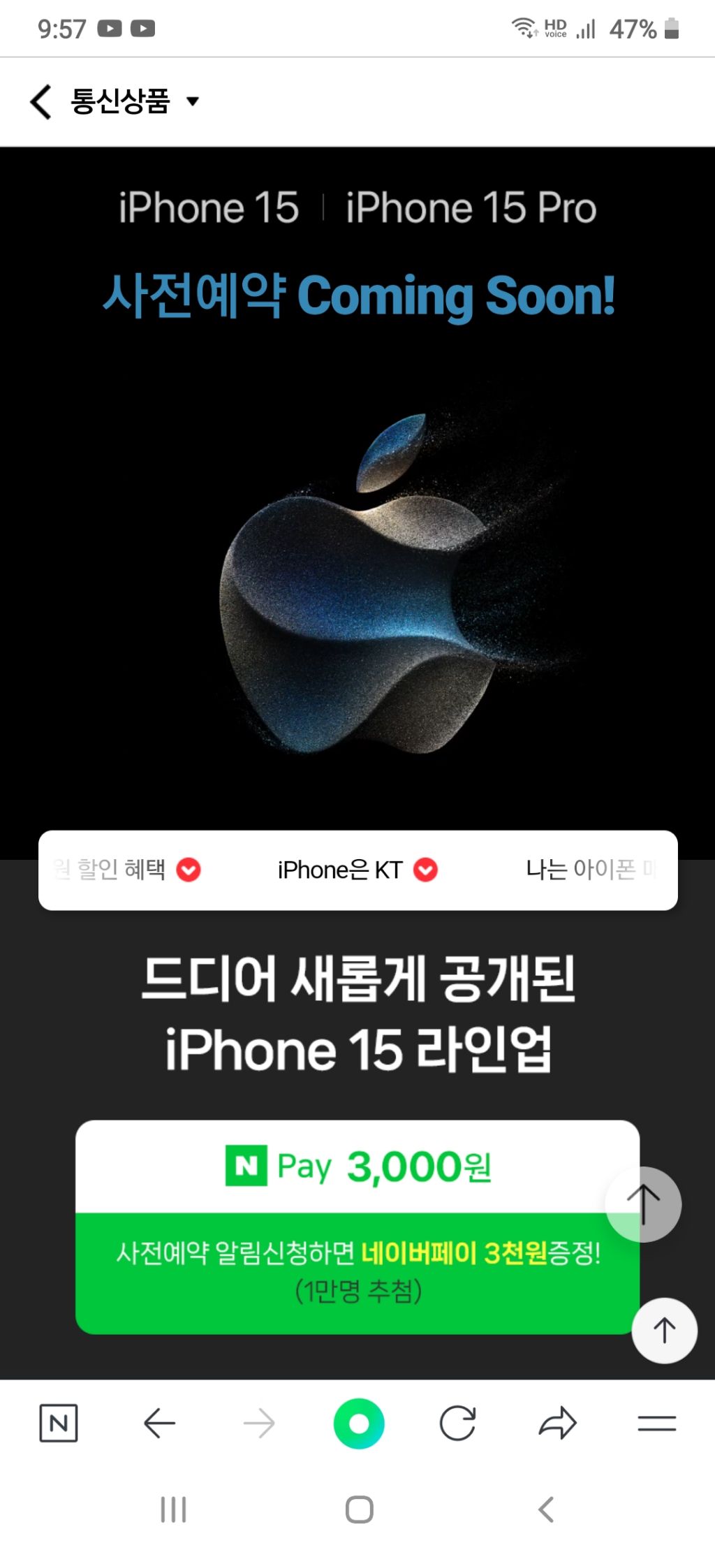 KT Shop.iPhone15 사전예약 알림신청 1만명(~10.4) 작성자나도쫌|작성시간23.09.13|조회수321 목록 댓글 0 글자크기 작게가 글자크기 크게가 기획전 | KT 공식 온라인몰 KT ShopiPhone15 사전예약 Coming Soonm.shop.kt.com:444 다음검색 현재 게시글 추가 기능 열기 북마크 공유하기 신고 센터로 신고 댓글 댓글 0 댓글쓰기 답글쓰기 댓글 리스트