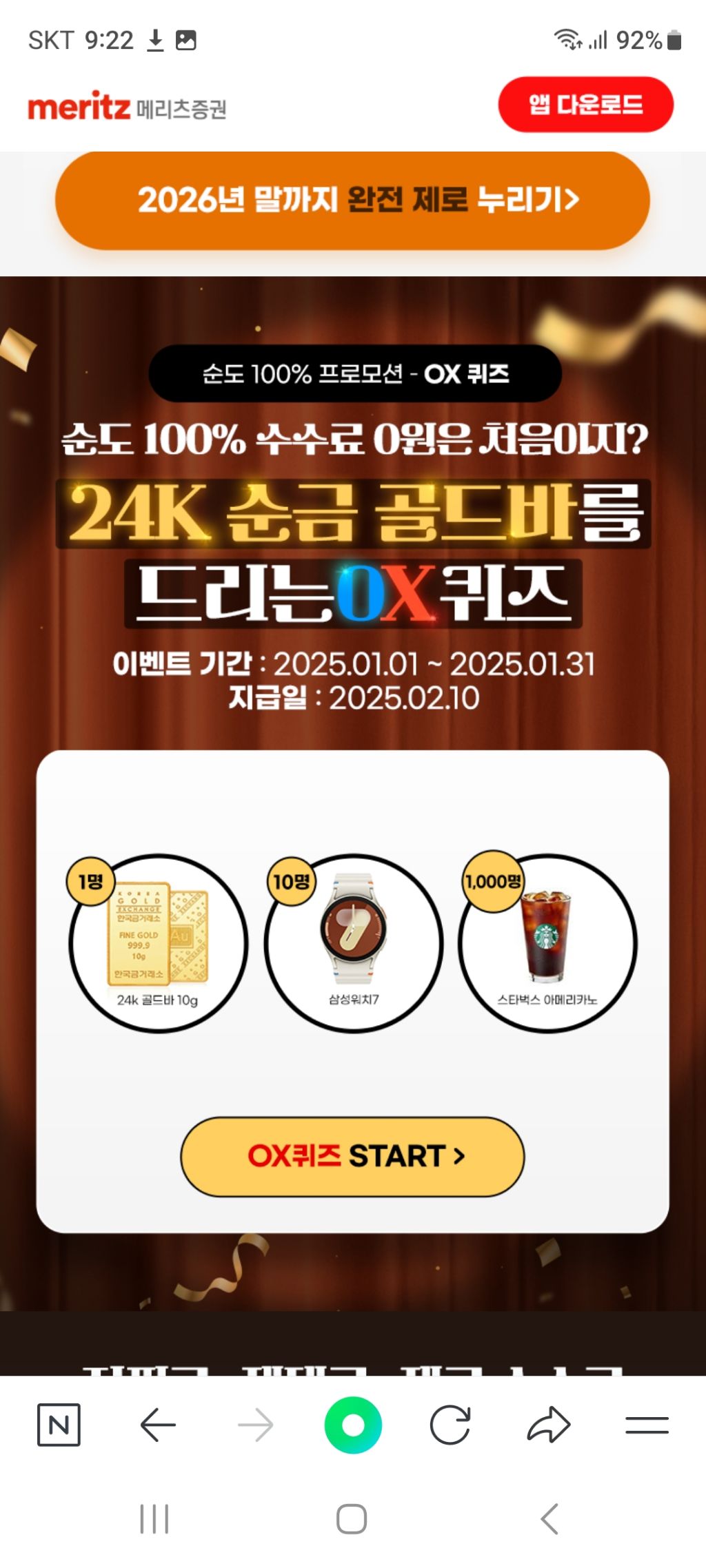 메리츠증권 OX퀴즈(~1.31) 작성자나도쫌|작성시간25.01.04|조회수351 목록 댓글 1 글자크기 작게가 글자크기 크게가 제대로 제로 수수료, 슈퍼365유관기관수수료도 완전 제로meritzevent.com 다음검색 현재 게시글 추가 기능 열기 북마크 공유하기 신고 센터로 신고 댓글 댓글 1 댓글쓰기 답글쓰기 댓글 리스트 작성자양미리777 | 작성시간 25.01.04 감사합니다 댓글 전체보기
