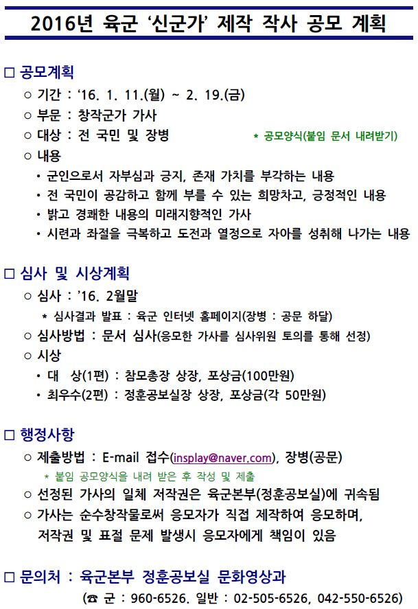 2016년 육군 '신군가' 제작 작사 공모(~2/19)