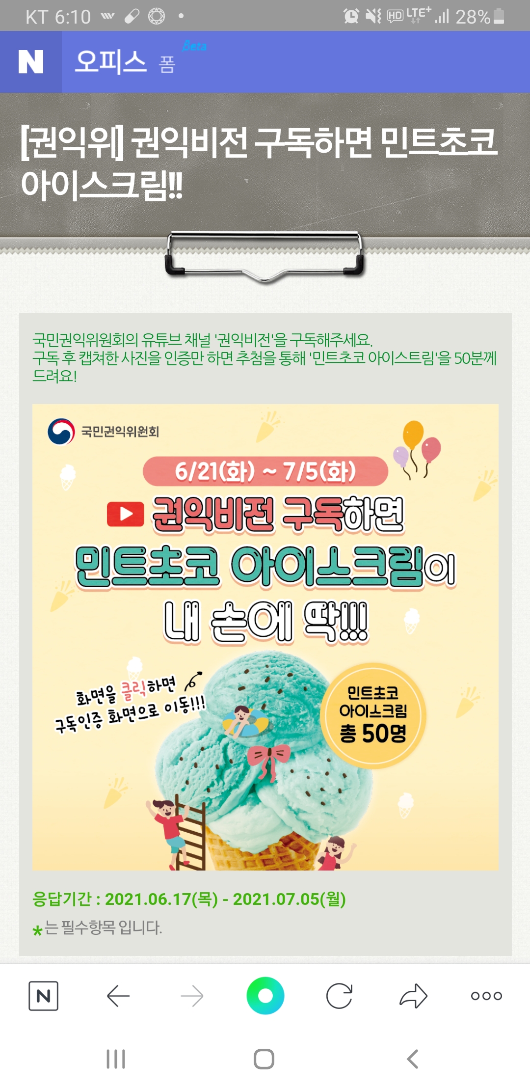 국민권익위원회 권익비전 구독 이벤트 (~7.5) 작성자난이언니|작성시간21.06.28|조회수383 목록 댓글 6 글자크기 작게가 글자크기 크게가 https://form.office.naver.com/form/responseView.cmd?formkey=MzlhMGUyM2UtOGQ0Ny00OGU1LWI1ZDQtNGE4NjQ4ODAwNmM1&sourceId=urlshare 다음검색 현재 게시글 추가 기능 열기 북마크 공유하기 신고 센터로 신고 댓글 댓글 6 댓글쓰기 답글쓰기 댓글 리스트 작성자네오베르베르 | 작성시간 21.06.28 감사합니다 작성자희야반쪼기~♡ | 작성시간 21.06.28 감사합니당 작성자초록빛하늘 | 작성시간 21.06.29 감사합니다 작성자스무디퀸 | 작성시간 21.06.30 ㅇㅁ ㄳ 작성자뽀롱이1 | 작성시간 21.07.05 감사합니다^^ 댓글 전체보기