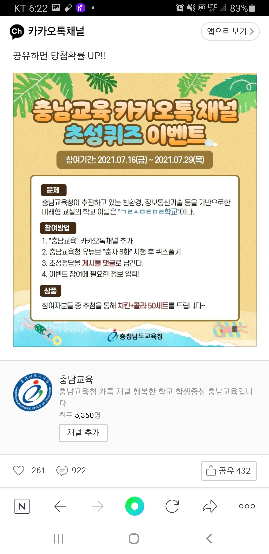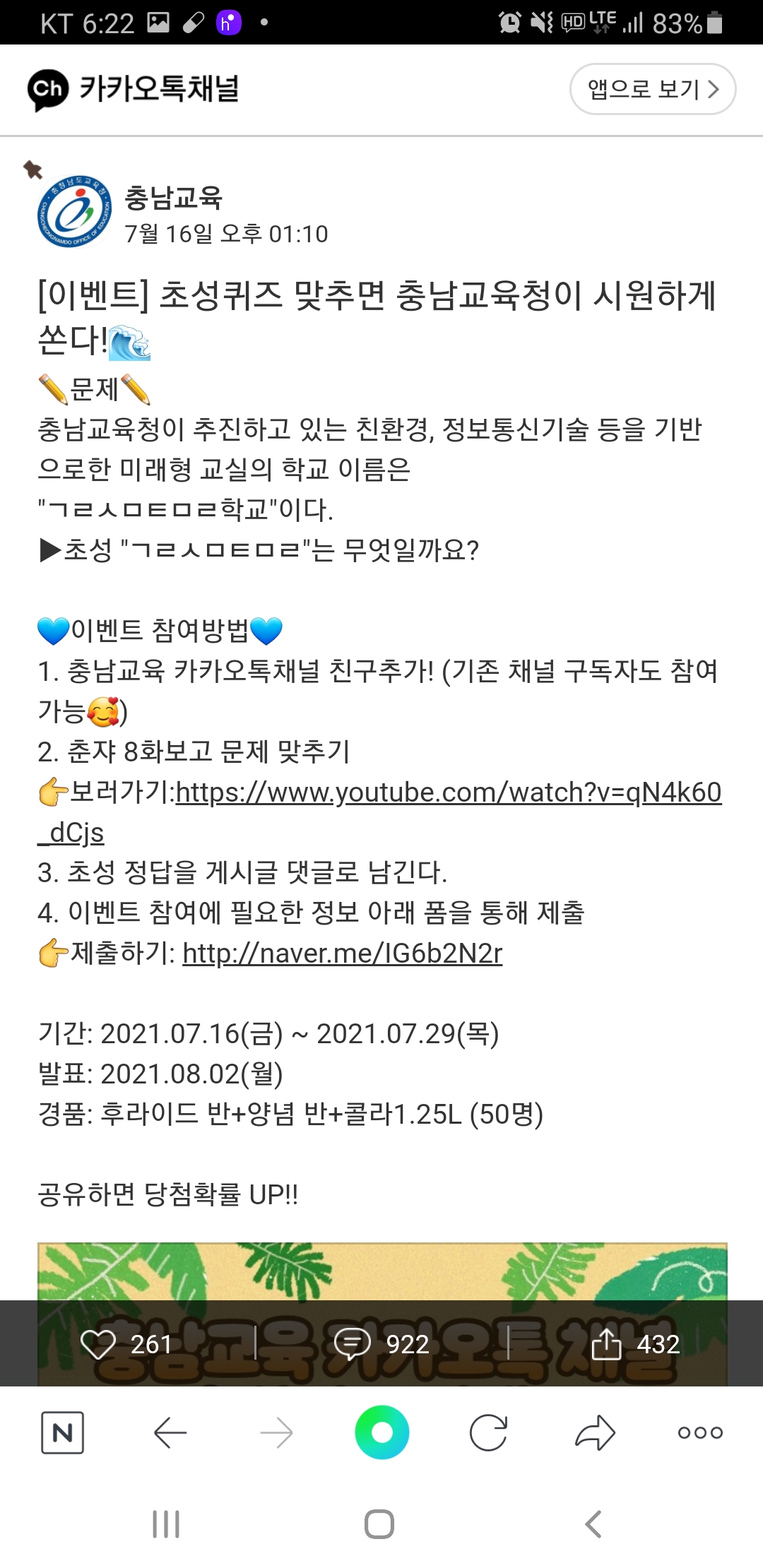 충남교육 카톡채널 초성퀴즈 이벤트 (~7.29) 작성자난이언니|작성시간21.07.20|조회수293 목록 댓글 2 글자크기 작게가 글자크기 크게가 https://pf.kakao.com/_xgxmBuT/81913281 #그린스마트미래 다음검색 현재 게시글 추가 기능 열기 북마크 공유하기 신고 센터로 신고 댓글 댓글 2 댓글쓰기 답글쓰기 댓글 리스트 작성자불멸의이순신 | 작성시간 21.07.20 감사합니다😀 작성자뽀롱이1 | 작성시간 21.07.29 감사합니다 댓글 전체보기