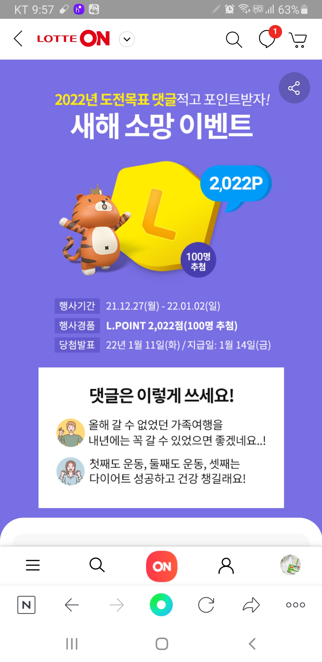 롯데온 새해소망 이벤트 (~1.2) 작성자난이언니|작성시간21.12.28|조회수529 목록 댓글 3 글자크기 작게가 글자크기 크게가 https://s.lotteon.com/NwIYRr77L 다음검색 현재 게시글 추가 기능 열기 북마크 공유하기 신고 센터로 신고 댓글 댓글 3 댓글쓰기 답글쓰기 댓글 리스트 작성자유운이 | 작성시간 21.12.28 감사하빈다 작성자쿨럭쿨쿨쿠쿨걱 | 작성시간 21.12.28 감사합니다.. 롯데는 정말 쪼잔하게 상품주는군요 ㅋㅋ 작성자네오베르베르 | 작성시간 21.12.28 감사합니다 댓글 전체보기
