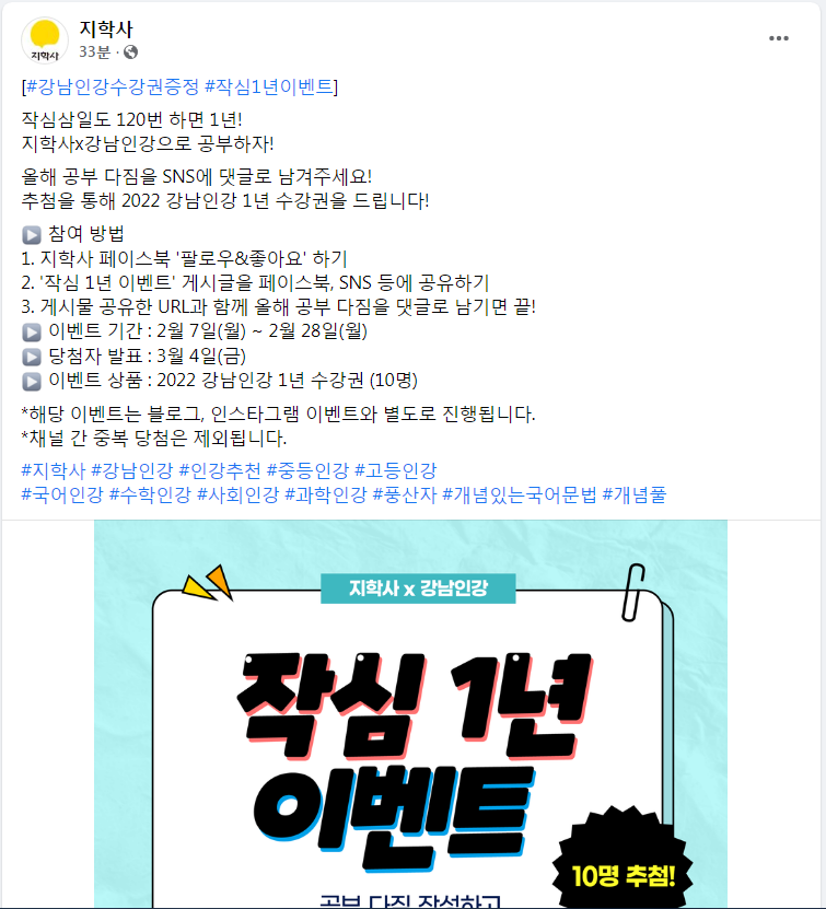 지학사, 지학사 X 강남인강 작심 1년 이벤트 (~2/28, 3/4발표) 작성자유운이|작성시간22.02.07|조회수492 목록 댓글 0 글자크기 작게가 글자크기 크게가 https://www.facebook.com/jihaksa/photos/a.1208719279162205/5242145882486171/지학사 - [#강남인강수강권증정 #작심1년이벤트] 작심삼일도 120번 하면 1년! 지학사x강남인강으[#강남인강수강권증정 #작심1년이벤트] 작심삼일도 120번 하면 1년! 지학사x강남인강으로 공부하자! 올해 공부 다짐을 SNS에 댓글로 남겨주세요! 추첨을 통해 2022 강남인강 1년 수강권을 드립니다! www.facebook.com 다음검색 현재 게시글 추가 기능 열기 북마크 공유하기 신고 센터로 신고 댓글 댓글 0 댓글쓰기 답글쓰기 댓글 리스트