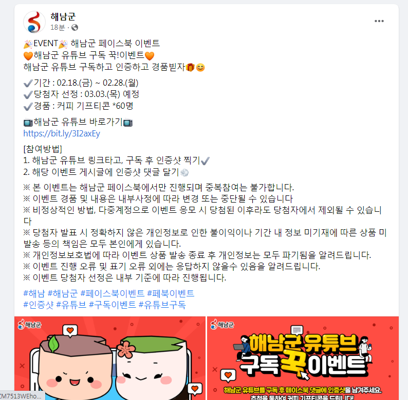 해남군, 페이스북 이벤트 해남군 유튜브 구독 이벤트 (~2/28, 3/3발표) 작성자유운이|작성시간22.02.18|조회수386 목록 댓글 2 글자크기 작게가 글자크기 크게가 https://www.facebook.com/haenampr/posts/5209785512386786로그인 또는 가입하여 보기Facebook에서 게시물, 사진 등을 확인하세요.www.facebook.com 다음검색 현재 게시글 추가 기능 열기 북마크 공유하기 신고 센터로 신고 댓글 댓글 2 댓글쓰기 답글쓰기 댓글 리스트 작성자네오베르베르 | 작성시간 22.02.18 감사합니다 작성자뽀롱이1 | 작성시간 22.03.02 감사합니다 댓글 전체보기