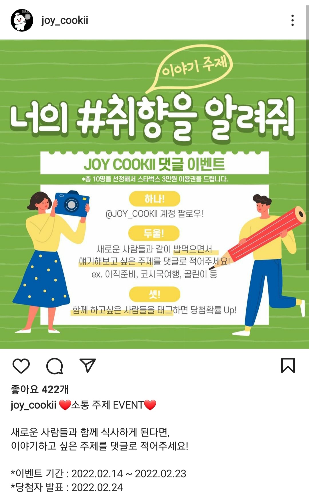 Joy cookii 댓글이벤트 (~2.23) 작성자난이언니|작성시간22.02.20|조회수306 목록 댓글 2 글자크기 작게가 글자크기 크게가 https://www.instagram.com/p/CZ8hdjpvAae/?utm_medium=copy_link 다음검색 현재 게시글 추가 기능 열기 북마크 공유하기 신고 센터로 신고 댓글 댓글 2 댓글쓰기 답글쓰기 댓글 리스트 작성자대박을위해 | 작성시간 22.02.21 감사합니다 작성자뽀롱이1 | 작성시간 22.02.23 감사합니다 댓글 전체보기