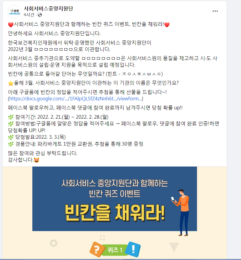 사회서비스중앙지원단, 사회서비스 중앙지원단과 함께하는 빈칸 퀴즈 이벤트, 빈칸을 채워라 (~2/28, 3/3발표) 작성자유운이|작성시간22.02.21|조회수416 목록 댓글 5 글자크기 작게가 글자크기 크게가 https://www.facebook.com/107665434314205/photos/a.107667707647311/487216229692455/사회서비스중앙지원단 - ❤️사회서비스 중앙지원단과 함께하는 빈칸 퀴즈 이벤트, 빈칸을 채워❤️사회서비스 중앙지원단과 함께하는 빈칸 퀴즈 이벤트, 빈칸을 채워라!❤️ 안녕하세요 사회서비스 중앙지원단입니다. 한국보건복지인재원에서 위탁·운영했던 사회서비스 중앙지원단이 20www.facebook.com정답: 중앙사회서비스원 구글폼에 정답 입력해야 하는데 칸이 없어서저는 그냥 이름 옆에 넣었네요 다음검색 현재 게시글 추가 기능 열기 북마크 공유하기 신고 센터로 신고 댓글 댓글 5 댓글쓰기 답글쓰기 댓글 리스트 작성자네오베르베르 | 작성시간 22.02.21 감사합니다 작성자광어 | 작성시간 22.02.22 정보 감사합니다. 작성자스무디퀸 | 작성시간 22.02.23 ㅇㅁ ㄳ 작성자Garlic05 | 작성시간 22.02.24 감사합니다! 작성자뽀롱이1 | 작성시간 22.03.02 감사합니다 댓글 전체보기