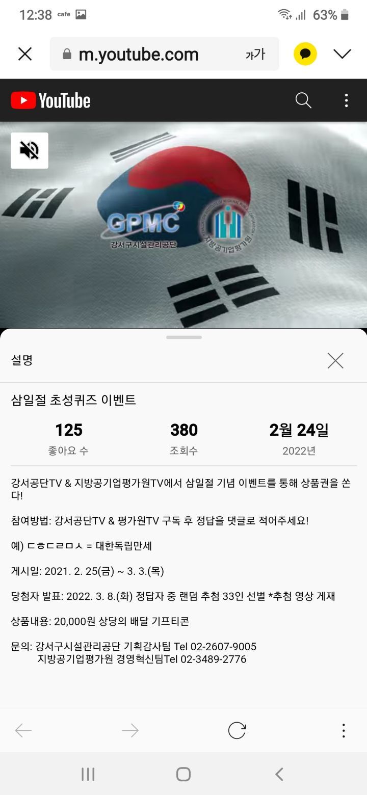 강서공단TV 삼일절 초성퀴즈이벤트 (~3.3) 작성자나도쫌|작성시간22.02.26|조회수365 목록 댓글 3 글자크기 작게가 글자크기 크게가 https://youtu.be/K2bexPTCD3U 다음검색 현재 게시글 추가 기능 열기 북마크 공유하기 신고 센터로 신고 댓글 댓글 3 댓글쓰기 답글쓰기 댓글 리스트 작성자Garlic05 | 작성시간 22.02.26 감사합니다! 작성자네오베르베르 | 작성시간 22.02.26 감사합니다 작성자뽀롱이1 | 작성시간 22.03.03 감사합니다 댓글 전체보기