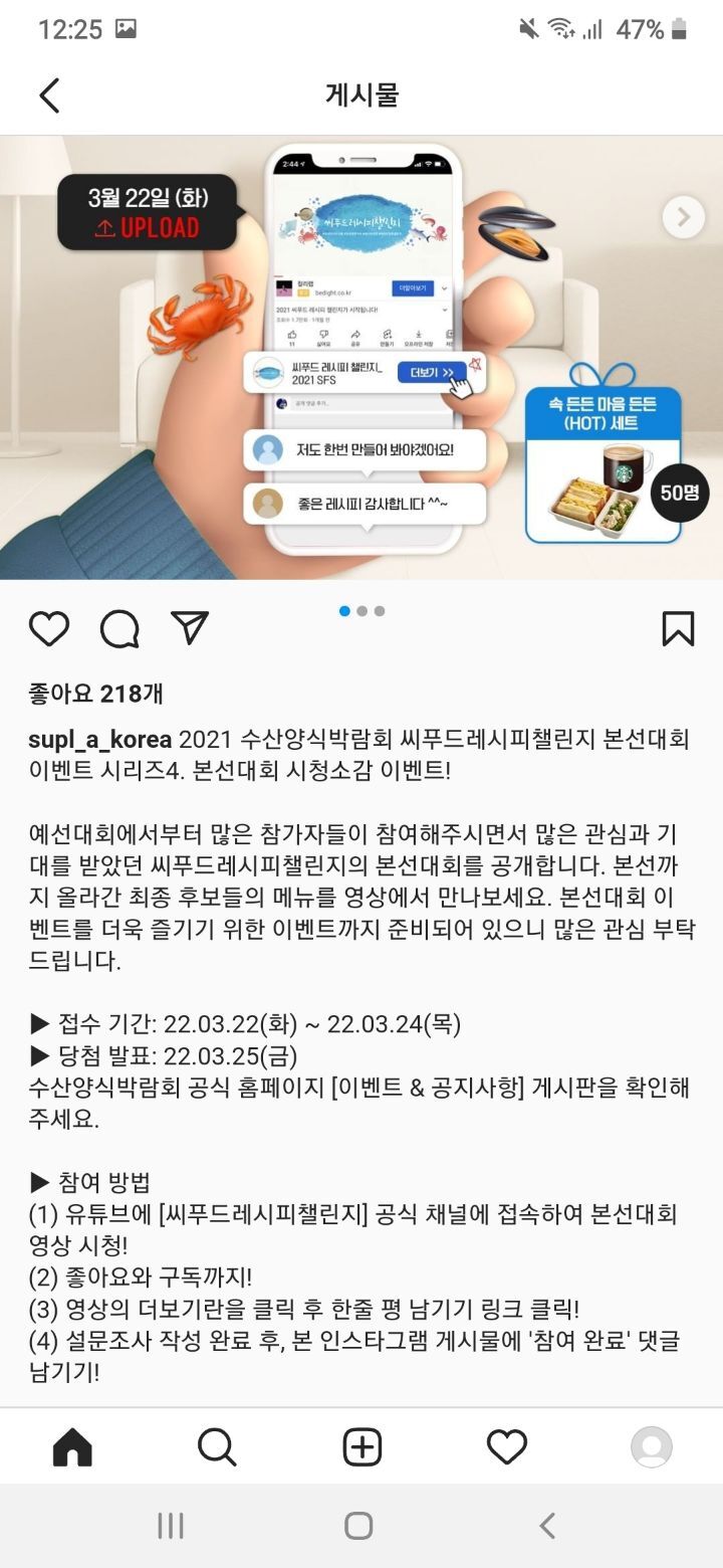 2021수산양식박람회 씨푸드레시피챌린지 본선대회 시청 소감이벤트(~3.24) 작성자나도쫌|작성시간22.03.24|조회수160 목록 댓글 0 글자크기 작게가 글자크기 크게가 https://www.instagram.com/p/CbZeADUPNHJ/?utm_source=ig_web_copy_link 다음검색 현재 게시글 추가 기능 열기 북마크 공유하기 신고 센터로 신고 댓글 댓글 0 댓글쓰기 답글쓰기 댓글 리스트