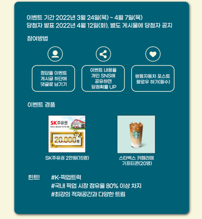 쌍용자동차 2022 올해의 차 선정 기념 퀴즈 이벤트 작성자야콩|작성시간22.03.24|조회수441 목록 댓글 2 글자크기 작게가 글자크기 크게가 https://m.post.naver.com/viewer/postView.naver?volumeNo=33505327&memberNo=36780718 [퀴즈 이벤트] ‘2022 올해의 차’에 선정된 쌍용차는?[BY 쌍용자동차] 지난 2월 쌍용자동차의 인기 모델이 한국자동차기자협회(KAJA)와 한국자동차전문기자...m.post.naver.com 다음검색 현재 게시글 추가 기능 열기 북마크 공유하기 신고 센터로 신고 댓글 댓글 2 댓글쓰기 답글쓰기 댓글 리스트 작성자네오베르베르 | 작성시간 22.03.24 감사합니다 작성자뽀롱이1 | 작성시간 22.03.28 감사합니다 댓글 전체보기