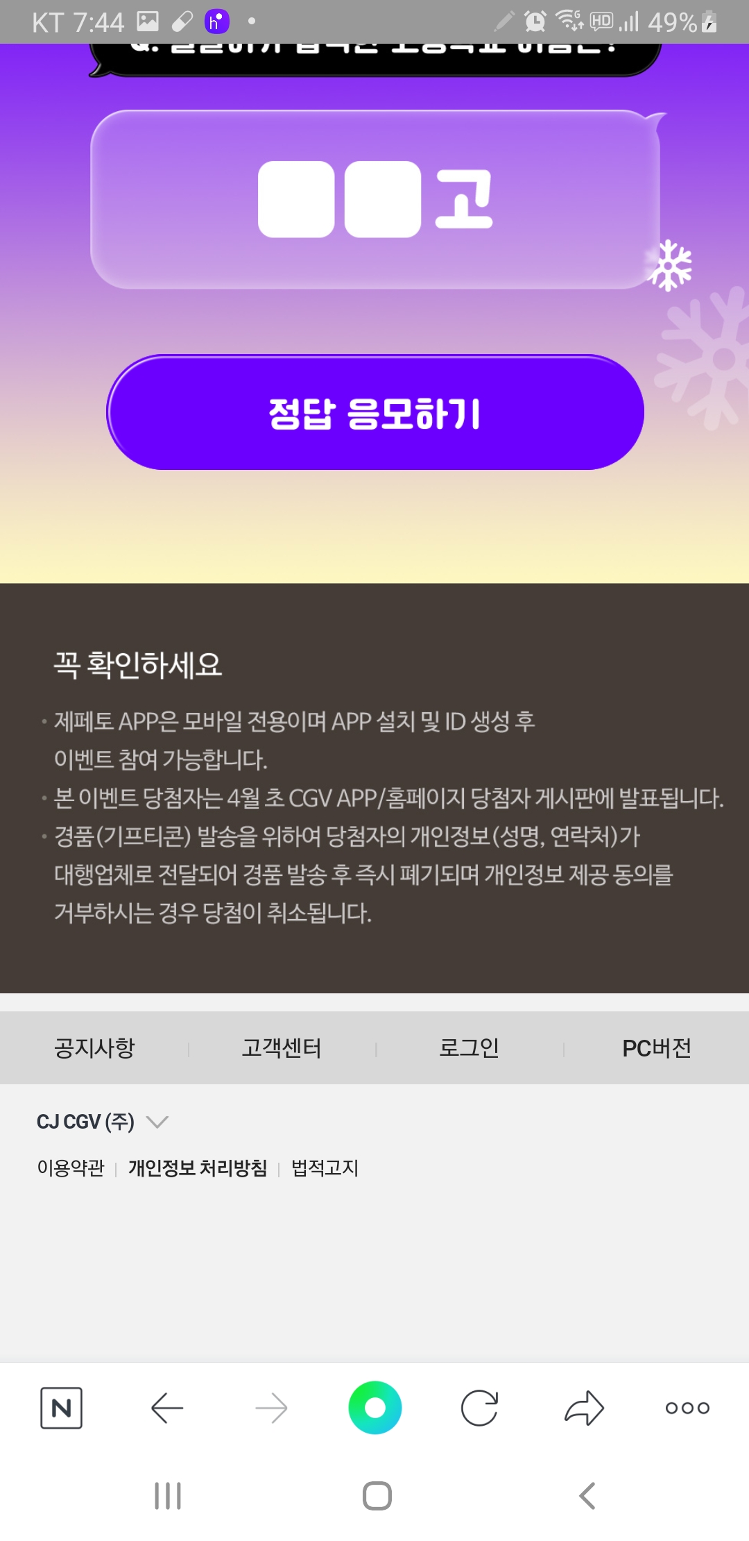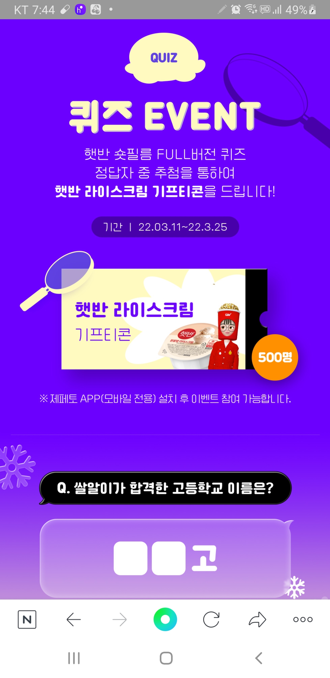 CGV 햇반 라이스크림 퀴즈 이벤트 (~3.25) 작성자난이언니|작성시간22.03.25|조회수265 목록 댓글 2 글자크기 작게가 글자크기 크게가 https://m.cgv.co.kr/WebApp/EventNotiV4/EventDetailGeneralUnited.aspx?seq=34156&mCode=001&iPage=1 #로그인필요 #냉동고 다음검색 현재 게시글 추가 기능 열기 북마크 공유하기 신고 센터로 신고 댓글 댓글 2 댓글쓰기 답글쓰기 댓글 리스트 작성자뽀롱이1 | 작성시간 22.03.25 감사합니다 작성자희야반쪼기~♡ | 작성시간 22.03.25 감사합니당 댓글 전체보기