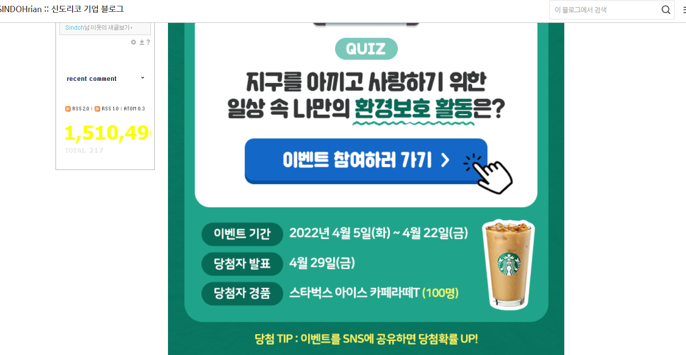신도리코 블로그 4월 이벤트 작성자야콩|작성시간22.04.05|조회수305 목록 댓글 3 글자크기 작게가 글자크기 크게가 https://blog.naver.com/sindohblog/222691995835[신도리코 블로그 4월 이벤트] 지구의 날을 맞이해 여러분이 실천하고 있는 환경보호 활동을 알안녕하세요. 신도리코 블로그입니다. 매년 4월 22일은 ‘지구의 날(Earth Day)’입니다. 지구의 날은 지...blog.naver.com 다음검색 현재 게시글 추가 기능 열기 북마크 공유하기 신고 센터로 신고 댓글 댓글 3 댓글쓰기 답글쓰기 댓글 리스트 작성자네오베르베르 | 작성시간 22.04.05 감사합니다 작성자스무디퀸 | 작성시간 22.04.10 ㅇㅁ ㄳ 작성자뽀롱이1 | 작성시간 22.04.11 감사합니다 댓글 전체보기