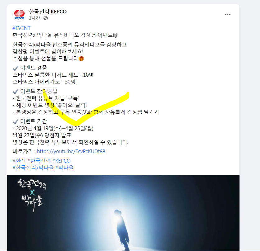 한국전력 KEPCO, 한국전력 x 박다울 뮤직비디오 감상평 이벤트 (~4/25) 작성자유운이|작성시간22.04.19|조회수277 목록 댓글 0 글자크기 작게가 글자크기 크게가 https://www.facebook.com/iamkepco/posts/5076178892429979Facebook에 로그인메뉴를 열려면 alt + / 키 조합을 누르세요www.facebook.com 다음검색 현재 게시글 추가 기능 열기 북마크 공유하기 신고 센터로 신고 댓글 댓글 0 댓글쓰기 답글쓰기 댓글 리스트