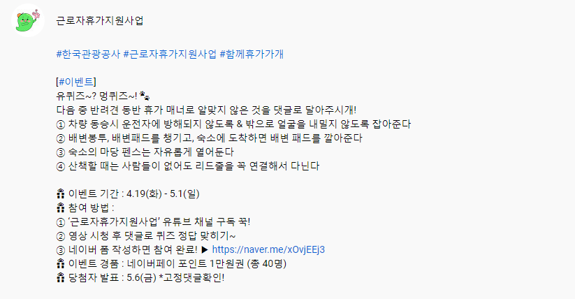 근로자휴가지원사업 유퀴즈~? 멍퀴즈~! 이벤트 작성자야콩|작성시간22.04.19|조회수369 목록 댓글 2 글자크기 작게가 글자크기 크게가 https://www.youtube.com/watch?v=DAst3VsxflI 다음검색 현재 게시글 추가 기능 열기 북마크 공유하기 신고 센터로 신고 댓글 댓글 2 댓글쓰기 답글쓰기 댓글 리스트 작성자네오베르베르 | 작성시간 22.04.19 감사합니다 작성자스무디퀸 | 작성시간 22.04.24 ㅇㅁ ㄳ 댓글 전체보기