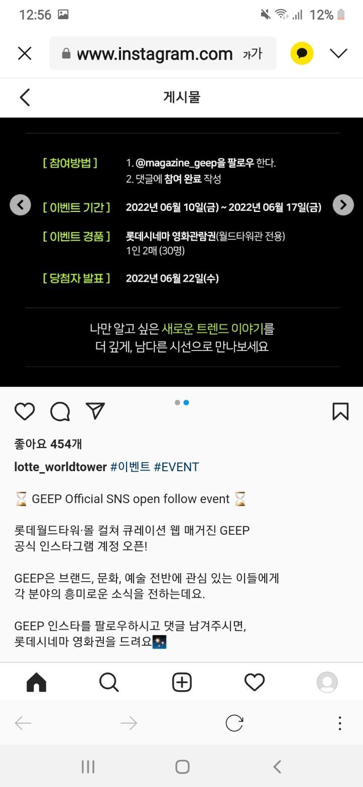 롯데월드타워.몰 컬쳐 큐레이션 웹 매거진 GEEP공식 인스타그램 오픈 이벤트 (~6.17) 작성자나도쫌|작성시간22.06.11|조회수184 목록 댓글 3 글자크기 작게가 글자크기 크게가 https://www.instagram.com/p/CempZpXO41_/?utm_source=ig_web_copy_link 다음검색 현재 게시글 추가 기능 열기 북마크 공유하기 신고 센터로 신고 댓글 댓글 3 댓글쓰기 답글쓰기 댓글 리스트 작성자Garlic05 | 작성시간 22.06.11 감사합니다. 작성자네오베르베르 | 작성시간 22.06.11 감사합니다 작성자뽀롱이1 | 작성시간 22.06.17 감사합니다 댓글 전체보기