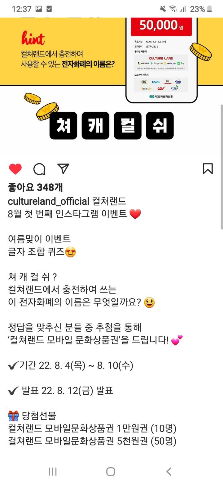 컬쳐랜드 글자조합퀴즈(~8.10) 작성자나도쫌|작성시간22.08.05|조회수262 목록 댓글 4 글자크기 작게가 글자크기 크게가 https://www.instagram.com/p/Cg1Pal2PQW-/?igshid=YmMyMTA2M2Y= 다음검색 현재 게시글 추가 기능 열기 북마크 공유하기 신고 센터로 신고 댓글 댓글 4 댓글쓰기 답글쓰기 댓글 리스트 작성자얼음골사과즙 | 작성시간 22.08.05 감사합니다 작성자Garlic05 | 작성시간 22.08.05 감사합니다. 작성자네오베르베르 | 작성시간 22.08.05 감사합니다 작성자아오이유우 | 작성시간 22.08.06 감사합니다 ❤ 댓글 전체보기