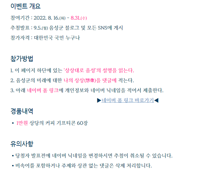 음성군 블로그 댓글 이벤트 ~8.31 작성자야콩|작성시간22.08.19|조회수363 목록 댓글 3 글자크기 작게가 글자크기 크게가 https://blog.naver.com/eumseonggun/222848061582🌟블로그 댓글 이벤트🌟 '상상대로 음성, 상상을 펼쳐라!'이벤트 개요 참여기간 : 2022. 8. 16.(화) ~ 8.31.(수) 추첨발표 : 9.5.(월) 음성군 블로그 및 모든 SNS...blog.naver.com 다음검색 현재 게시글 추가 기능 열기 북마크 공유하기 신고 센터로 신고 댓글 댓글 3 댓글쓰기 답글쓰기 댓글 리스트 작성자Garlic05 | 작성시간 22.08.19 감사합니다. 작성자네오베르베르 | 작성시간 22.08.20 감사합니다 작성자아오이유우 | 작성시간 22.08.31 감사합니다 ❤ 댓글 전체보기