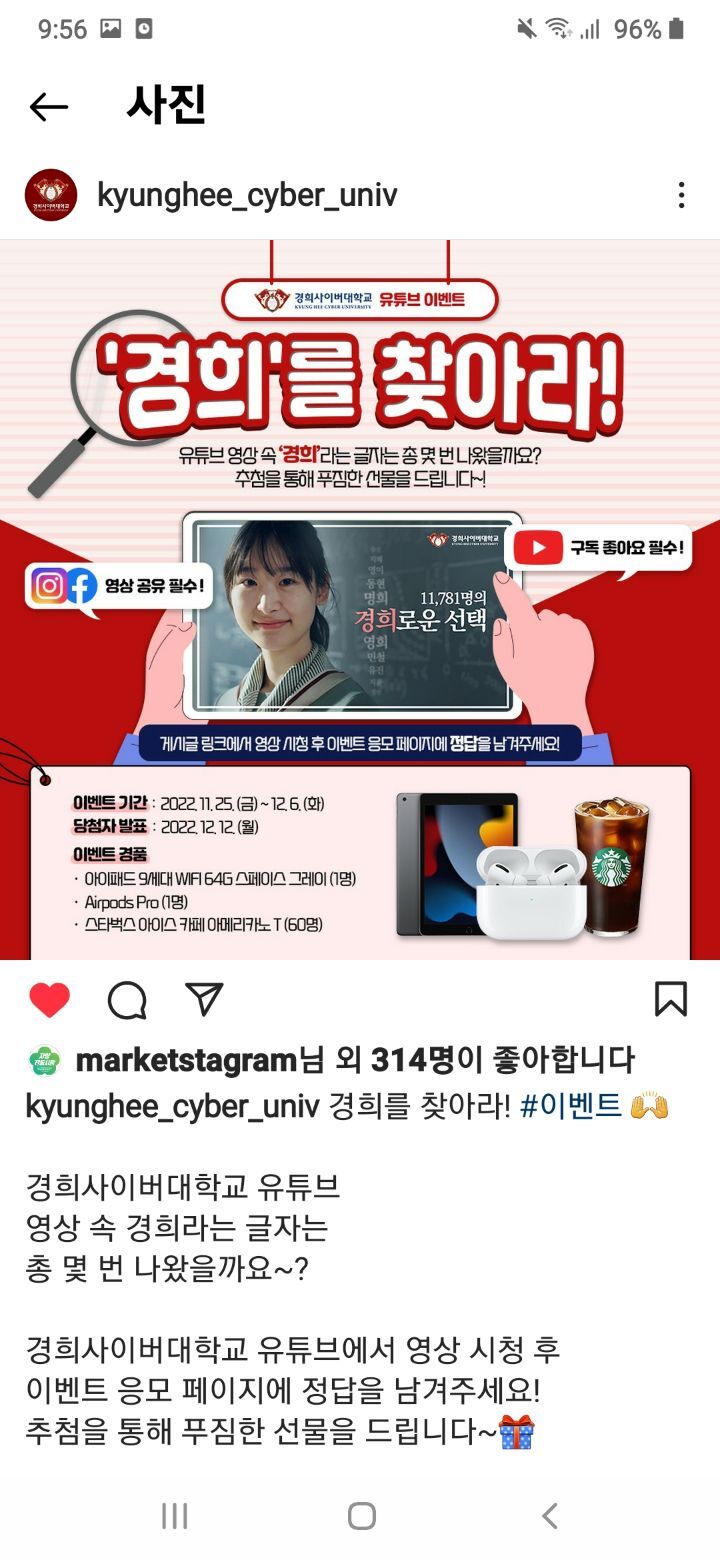 경희사이버대학교 .경희를 찾아라 이벤트 (~12.6) 작성자나도쫌|작성시간22.11.26|조회수281 목록 댓글 2 글자크기 작게가 글자크기 크게가 https://www.instagram.com/p/ClX2RQXsuJa/?igshid=YmMyMTA2M2Y= 다음검색 현재 게시글 추가 기능 열기 북마크 공유하기 신고 센터로 신고 댓글 댓글 2 댓글쓰기 답글쓰기 댓글 리스트 작성자네오베르베르 | 작성시간 22.11.27 감사합니다 작성자호이짜 | 작성시간 22.12.06 감사합니디^^ 댓글 전체보기
