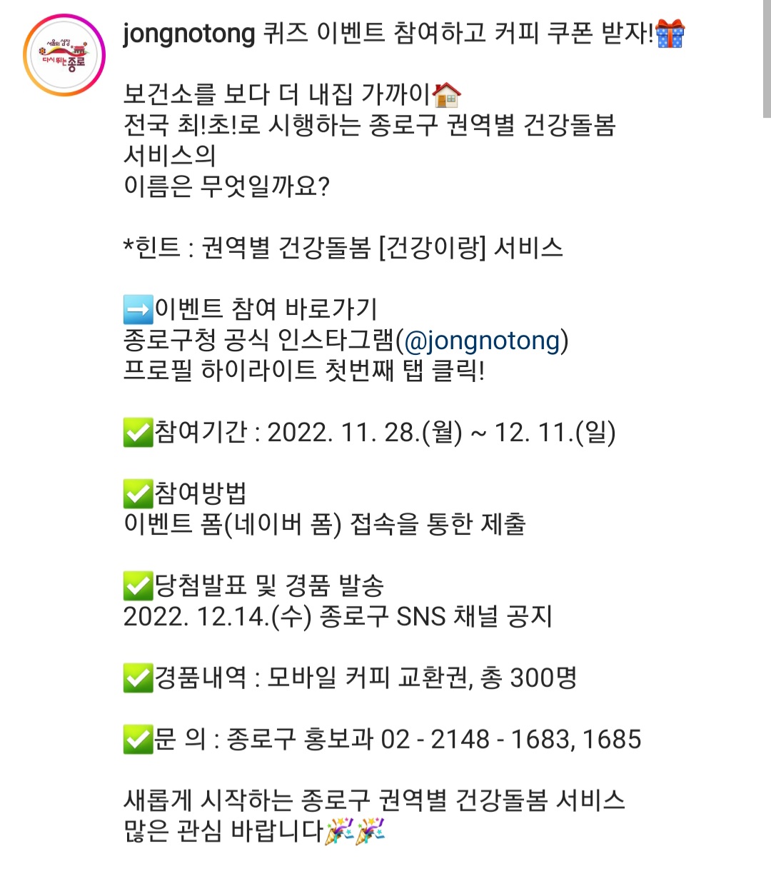 종로구청 퀴즈이벤트 (~12.11) 작성자난이언니|작성시간22.11.29|조회수490 목록 댓글 2 글자크기 작게가 글자크기 크게가 https://www.instagram.com/p/ClfEZM8Sc6o/?igshid=YmMyMTA2M2Y= 다음검색 현재 게시글 추가 기능 열기 북마크 공유하기 신고 센터로 신고 댓글 댓글 2 댓글쓰기 답글쓰기 댓글 리스트 작성자팥빙수좋아라 | 작성시간 22.12.02 감사합니다 작성자호이짜 | 작성시간 22.12.11 감사합니다^^ 댓글 전체보기