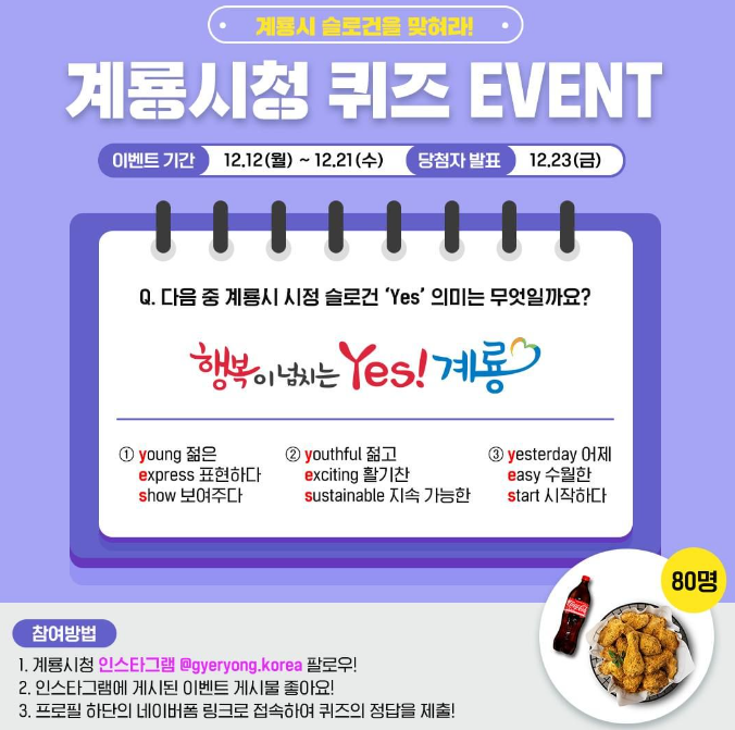 계룡시청 계룡시의 시정 슬로건 'yes'의 의미는 무엇일까요? ~12.21 작성자야콩|작성시간22.12.13|조회수616 목록 댓글 6 글자크기 작게가 글자크기 크게가 https://www.instagram.com/p/CmD-1VzJyMh/Instagram의 계룡시청님 : "계룡시청 EVENT] 계룡시를 사랑해주시는 여러분을 위해 준비계룡시청님이 Instagram에 게시물을 공유했습니다:"계룡시청 EVENT] 계룡시를 사랑해주시는 여러분을 위해 준비한 특별한 이벤트! 🙌 민선 8기, 계룡시의 시정 슬로건 'yes'의 의미는 무www.instagram.com2.youthful 젊고 exciting 활기찬 sustainable 지속 가능한 다음검색 현재 게시글 추가 기능 열기 북마크 공유하기 신고 센터로 신고 댓글 댓글 6 댓글쓰기 답글쓰기 댓글 리스트 작성자star | 작성시간 22.12.13 ㄱㅅ 작성자네오베르베르 | 작성시간 22.12.14 감사합니다 작성자강낭콩님 | 작성시간 22.12.14 감사합니다 작성자호이짜 | 작성시간 22.12.16 감사합니다^^ 작성자팥빙수좋아라 | 작성시간 22.12.19 감사합니다 댓글 전체보기