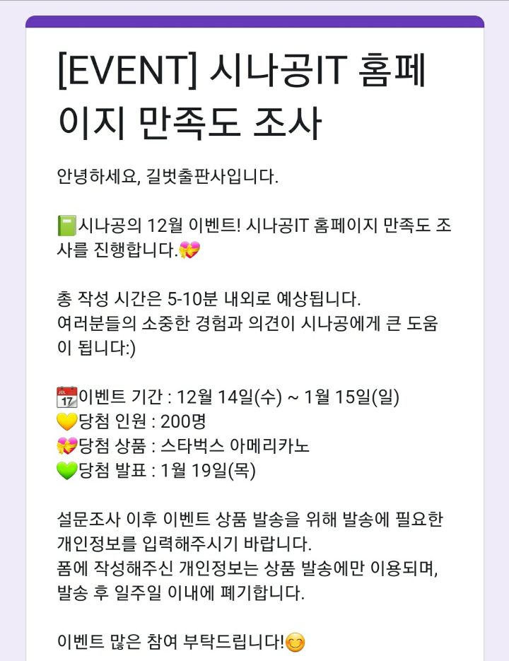 길벗출판사. 시나공IT 홈페이지 만족도 조사(~1.15) 작성자나도쫌|작성시간22.12.24|조회수391 목록 댓글 1 글자크기 작게가 글자크기 크게가 [EVENT] 시나공IT 홈페이지 만족도 조사안녕하세요, 길벗출판사입니다. 📗시나공의 12월 이벤트! 시나공IT 홈페이지 만족도 조사를 진행합니다.💝 총 작성 시간은 5-10분 내외로 예상됩니다. 여러분들의 소중한 경험과 의견이 시나공docs.google.com 다음검색 현재 게시글 추가 기능 열기 북마크 공유하기 신고 센터로 신고 댓글 댓글 1 댓글쓰기 답글쓰기 댓글 리스트 작성자도숑 | 작성시간 22.12.24 감사합니다^^ 댓글 전체보기