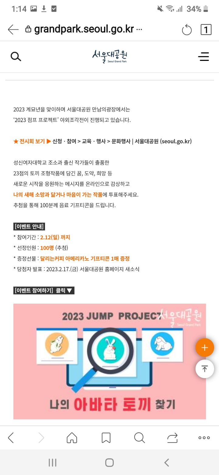 서울대공원 . 나의 아바타 토끼 찾기(~2.12) 작성자나도쫌|작성시간23.02.06|조회수332 목록 댓글 3 글자크기 작게가 글자크기 크게가 서울대공원숲과 동물, 사람이 함께 어우러져 모두가 행복한 서울대공원 입니다.grandpark.seoul.go.kr 다음검색 현재 게시글 추가 기능 열기 북마크 공유하기 신고 센터로 신고 댓글 댓글 3 댓글쓰기 답글쓰기 댓글 리스트 작성자Garlic05 | 작성시간 23.02.06 감사합니다. 작성자네오베르베르 | 작성시간 23.02.06 감사합니다 작성자아오이유우 | 작성시간 23.02.10 감사합니다 ❤ 댓글 전체보기