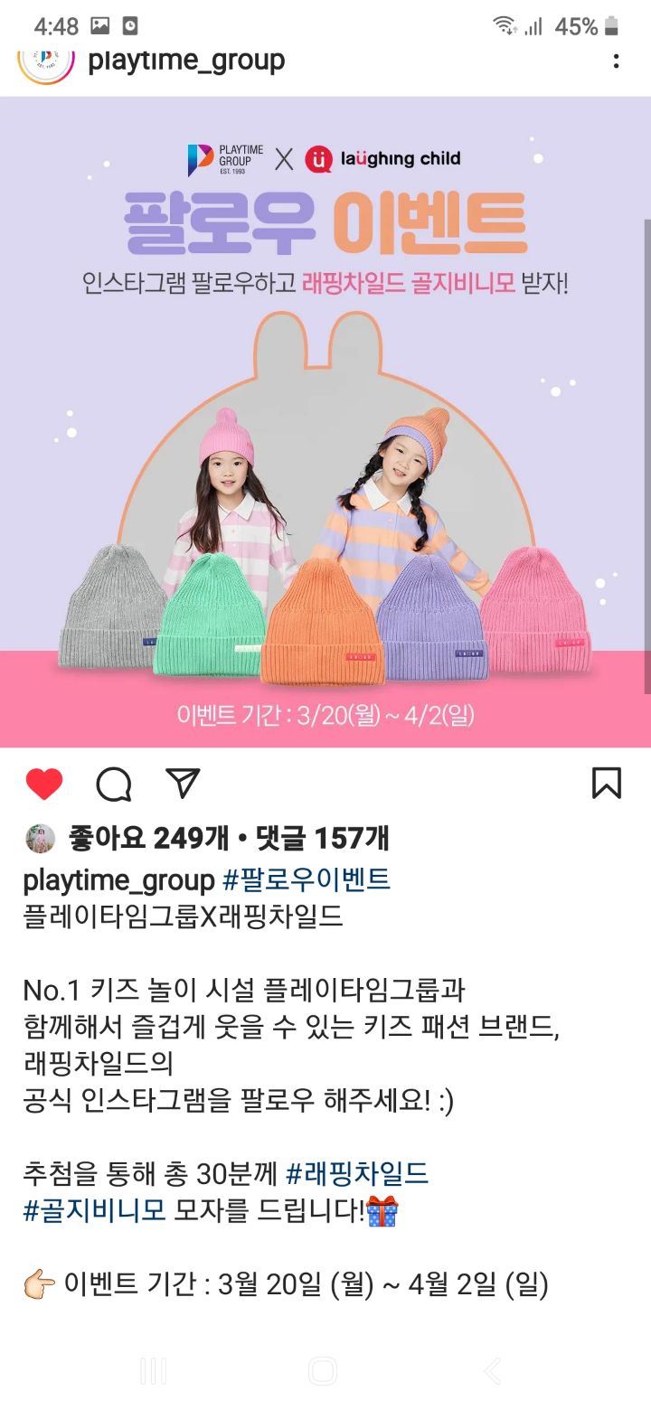 플레이타임 그룹×래핑차일드 팔로우이벤트(~4.2) 작성자나도쫌|작성시간23.03.20|조회수171 목록 댓글 1 글자크기 작게가 글자크기 크게가 https://www.instagram.com/p/Cp_cYpiP58S/?igshid=YmMyMTA2M2Y= 다음검색 현재 게시글 추가 기능 열기 북마크 공유하기 신고 센터로 신고 댓글 댓글 1 댓글쓰기 답글쓰기 댓글 리스트 작성자네오베르베르 | 작성시간 23.03.21 감사합니다 댓글 전체보기