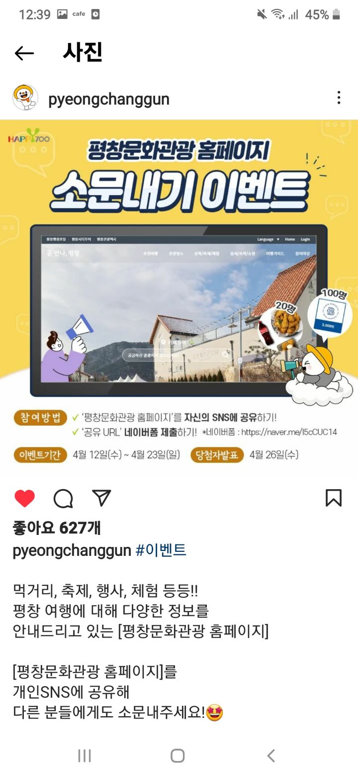 평창문화관광 홈페이지 소문내기이벤트 (~4.23) 작성자나도쫌|작성시간23.04.15|조회수180 목록 댓글 1 글자크기 작게가 글자크기 크게가 https://www.instagram.com/p/Cq7S7M9vhyY/?igshid=YmMyMTA2M2Y= 다음검색 현재 게시글 추가 기능 열기 북마크 공유하기 신고 센터로 신고 댓글 댓글 1 댓글쓰기 답글쓰기 댓글 리스트 작성자네오베르베르 | 작성시간 23.04.15 감사합니다 댓글 전체보기