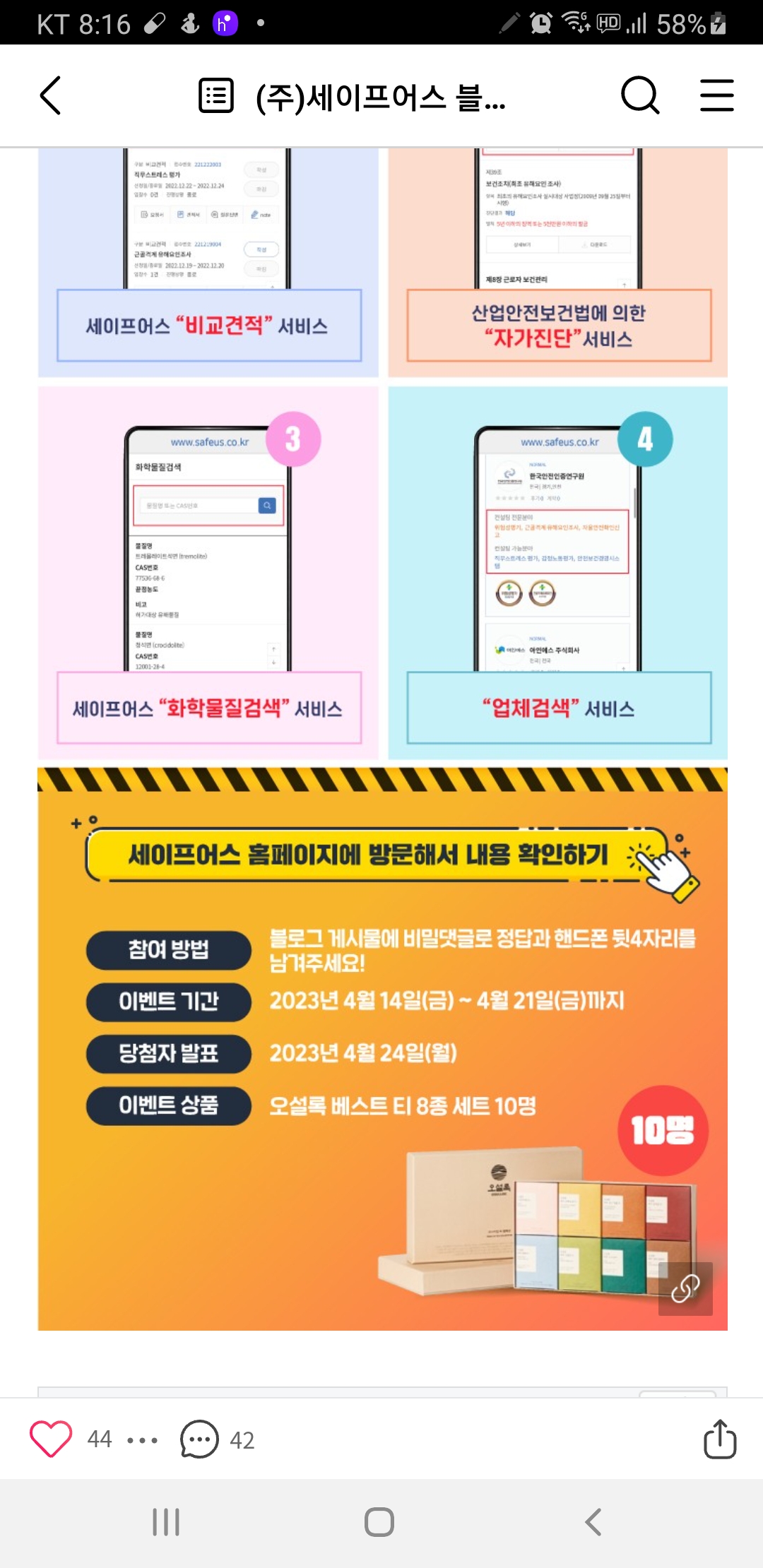 세이프어스 퀴즈이벤트 (~4.21) 작성자난이언니|작성시간23.04.15|조회수276 목록 댓글 1 글자크기 작게가 글자크기 크게가 https://m.blog.naver.com/sugroup7904/223074375662 다음검색 현재 게시글 추가 기능 열기 북마크 공유하기 신고 센터로 신고 댓글 댓글 1 댓글쓰기 답글쓰기 댓글 리스트 작성자네오베르베르 | 작성시간 23.04.15 감사합니다 댓글 전체보기