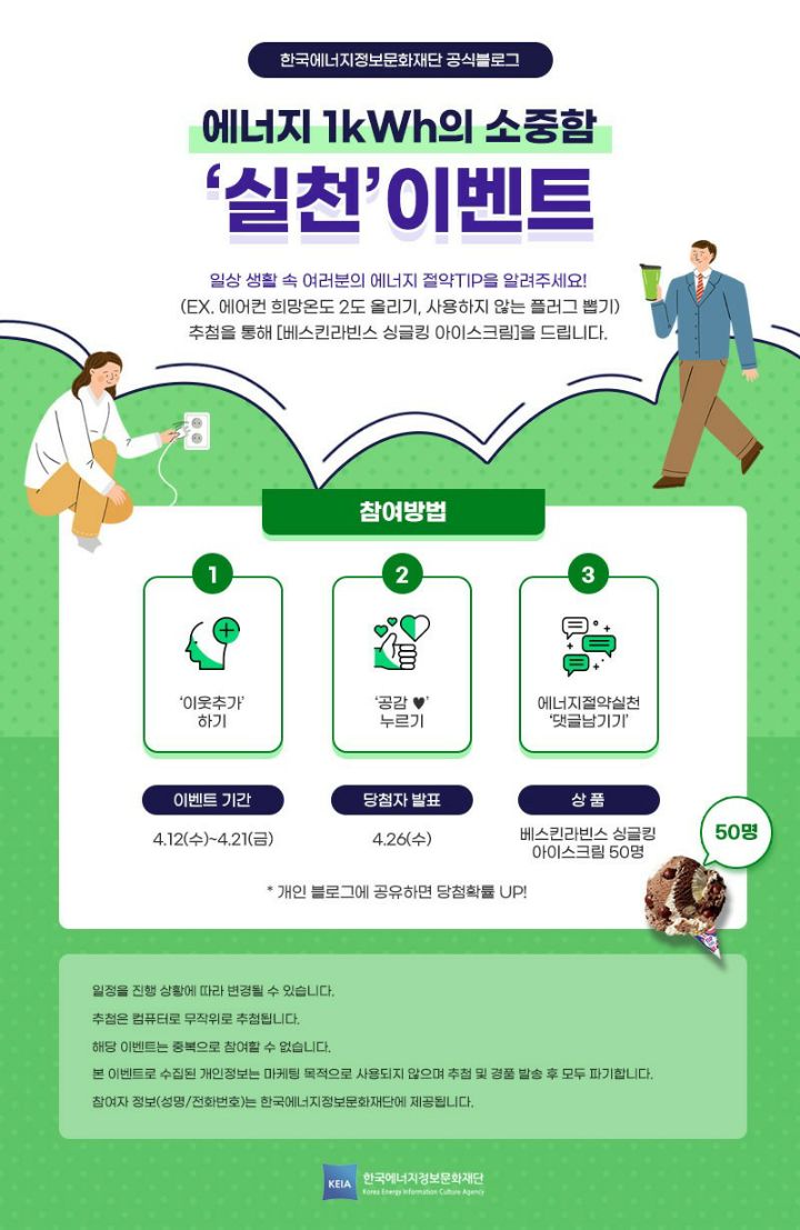 한국에너지정보문화재단. 에너지1kWh의 소중함 '실천 이벤트(~4.21) 작성자나도쫌|작성시간23.04.16|조회수261 목록 댓글 0 글자크기 작게가 글자크기 크게가 [이벤트] 에너지1kWh의 소중함 '실천 이벤트'참여하고, 베스킨라빈스 싱글킹 아이스크림 받자!한국에너지정보문화재단 공식블로그 "에너지 1kWh의 소중함" [실천 이벤트] 일상 생활 속 여러...blog.naver.com 다음검색 현재 게시글 추가 기능 열기 북마크 공유하기 신고 센터로 신고 댓글 댓글 0 댓글쓰기 답글쓰기 댓글 리스트