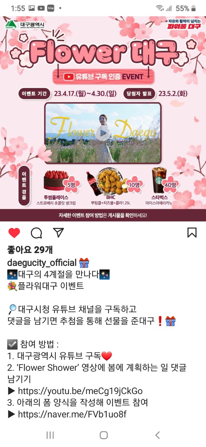 대구광역시 Flower대구 유튜브 구독이벤트 (~4.30) 작성자나도쫌|작성시간23.04.17|조회수209 목록 댓글 1 글자크기 작게가 글자크기 크게가 https://www.instagram.com/p/CrH5xdvp5x-/?igshid=YmMyMTA2M2Y= 다음검색 현재 게시글 추가 기능 열기 북마크 공유하기 신고 센터로 신고 댓글 댓글 1 댓글쓰기 답글쓰기 댓글 리스트 작성자네오베르베르 | 작성시간 23.04.18 감사합니다 댓글 전체보기