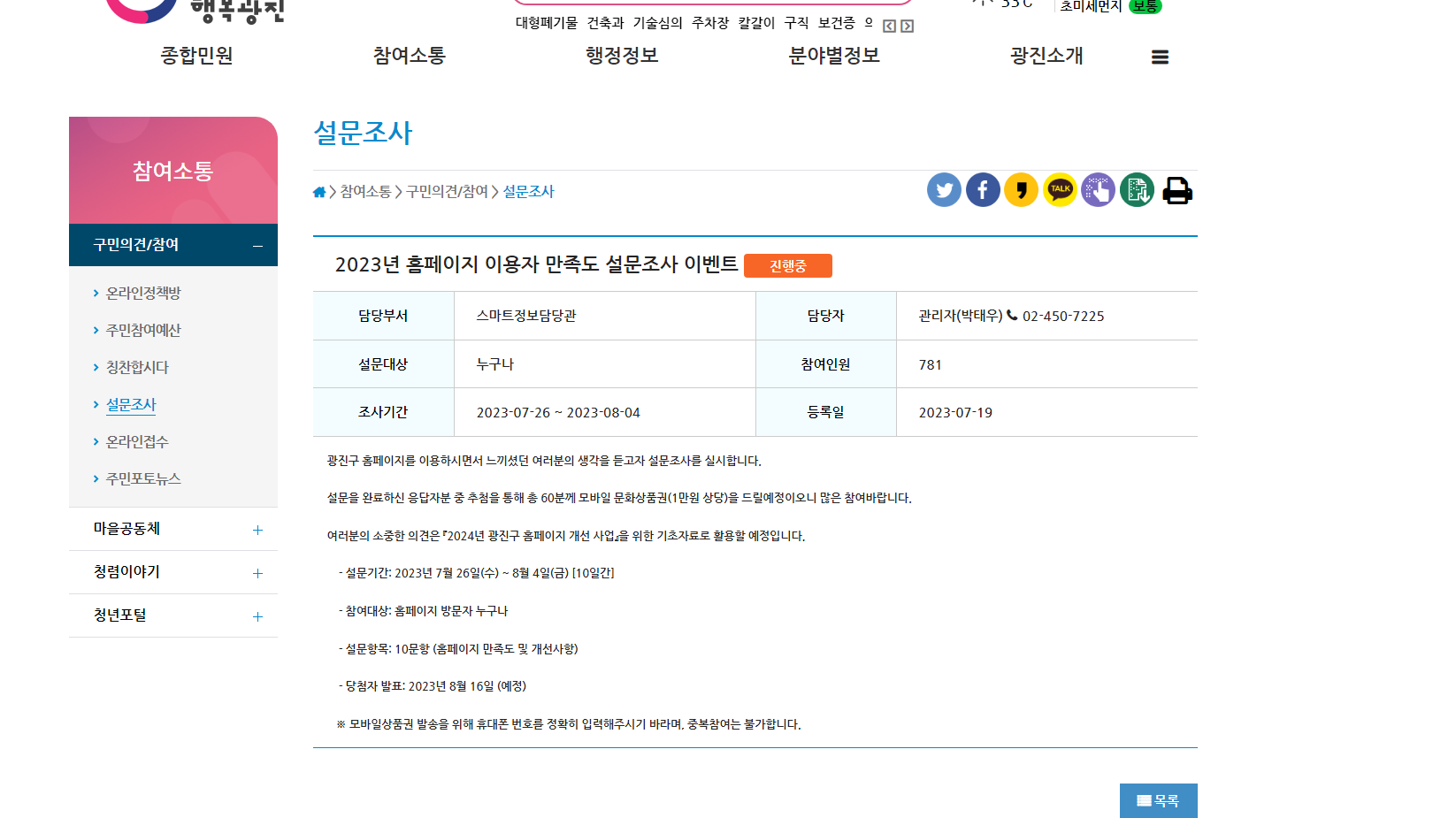 광진구청, 2023년 홈페이지 이용자 만족도 설문조사 이벤트 (~8.4) 작성자유운이|작성시간23.08.02|조회수228 목록 댓글 1 글자크기 작게가 글자크기 크게가 https://gwangjin.go.kr/portal/qestnar/qustnr/view.do?qustnrSn=76&menuNo=200060&pageUnit=10&pageIndex=1 설문조사 < 구민의견/참여 < 참여소통 < 포털사이트2023년 홈페이지 이용자 만족도 설문조사 이벤트 진행중 담당부서 스마트정보담당관 담당자 관리자(박태우) 02-450-7225 설문대상 누구나 참여인원 782 조사기간 2023-07-26 ~ 2023-08-04 등록일 2023-07-19 광gwangjin.go.kr 다음검색 현재 게시글 추가 기능 열기 북마크 공유하기 신고 센터로 신고 댓글 댓글 1 댓글쓰기 답글쓰기 댓글 리스트 작성자스무디퀸 | 작성시간 23.08.02 ㅇㅁ ㄳ 댓글 전체보기