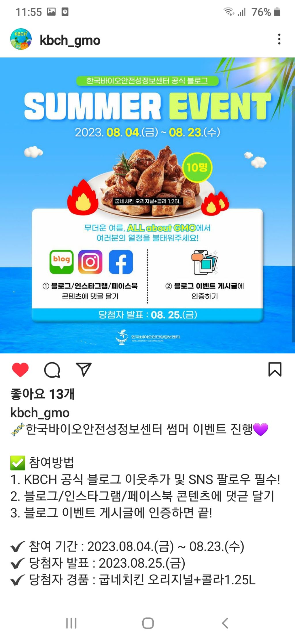 한국바이오안전성정보센터 썸머 이벤트 (~8.23) 작성자나도쫌|작성시간23.08.04|조회수197 목록 댓글 1 글자크기 작게가 글자크기 크게가 https://www.instagram.com/p/CvgR7eoywnb/?igshid=MzRlODBiNWFlZA== 다음검색 현재 게시글 추가 기능 열기 북마크 공유하기 신고 센터로 신고 댓글 댓글 1 댓글쓰기 답글쓰기 댓글 리스트 작성자네오베르베르 | 작성시간 23.08.04 감사합니다 댓글 전체보기