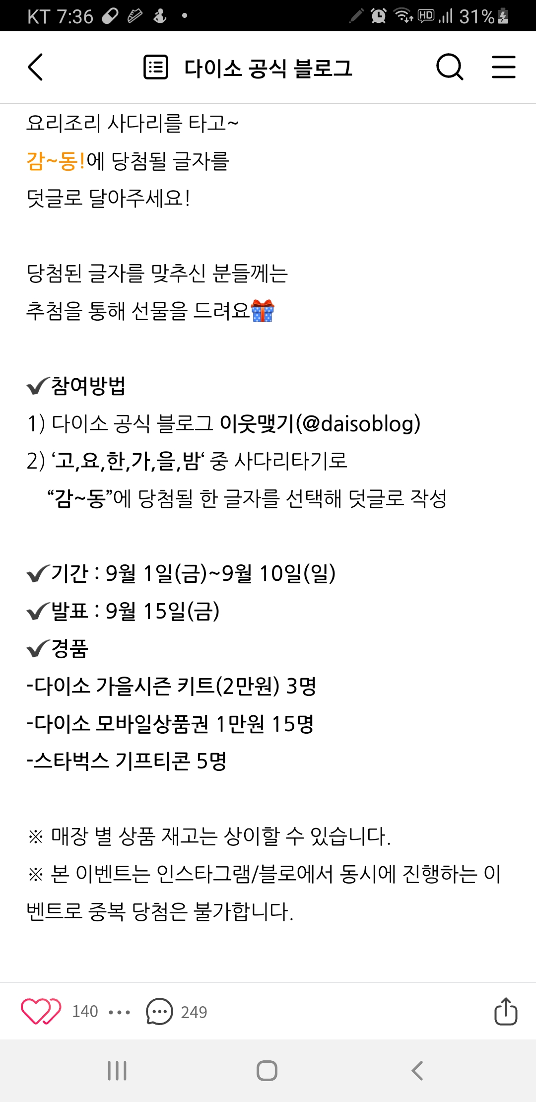 다이소 사다리타기 이벤트 (~9.10) 작성자난이언니|작성시간23.09.02|조회수183 목록 댓글 1 글자크기 작게가 글자크기 크게가 https://m.blog.naver.com/daisoblog/223199761671 다음검색 현재 게시글 추가 기능 열기 북마크 공유하기 신고 센터로 신고 댓글 댓글 1 댓글쓰기 답글쓰기 댓글 리스트 작성자네오베르베르 | 작성시간 23.09.02 감사합니다 댓글 전체보기