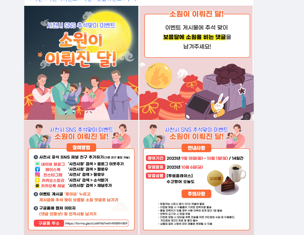 사천시청, SNS 추석맞이 이벤트 소원이 이뤄진 달! (~10.1) 작성자유운이|작성시간23.09.18|조회수152 목록 댓글 1 글자크기 작게가 글자크기 크게가 https://www.facebook.com/risingsacheon/posts/pfbid02dKZF4XPbBQNALvz8qoiqNFt6TKn7SkscVZmzR3SevTXQAwvdwXUiriMRfvafsP4NlFacebook에 로그인Notice 계속하려면 로그인해주세요.www.facebook.com 다음검색 현재 게시글 추가 기능 열기 북마크 공유하기 신고 센터로 신고 댓글 댓글 1 댓글쓰기 답글쓰기 댓글 리스트 작성자네오베르베르 | 작성시간 23.09.19 감사합니다 댓글 전체보기