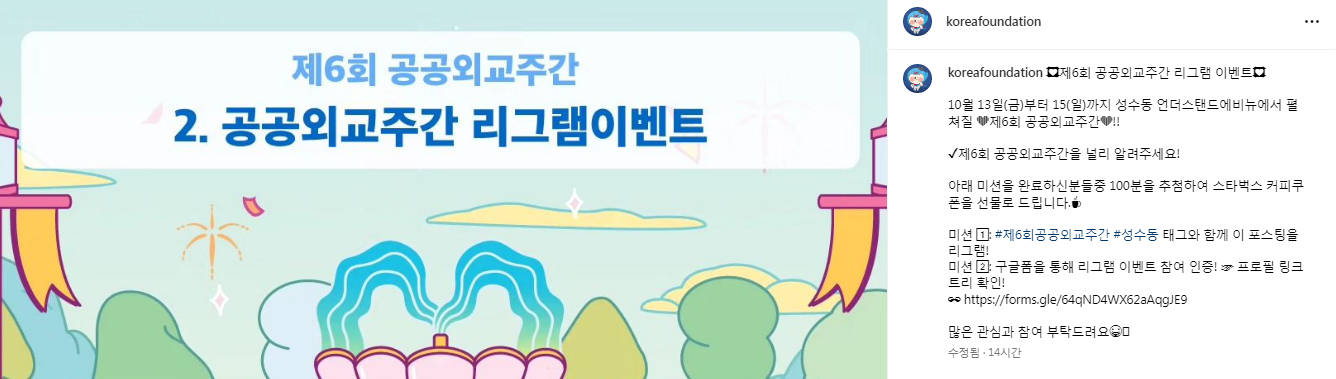 한국국제교류재단, 제6회 공공외교주간 리그램 이벤트 (~10.15) 작성자유운이|작성시간23.10.01|조회수138 목록 댓글 0 글자크기 작게가 글자크기 크게가 https://www.instagram.com/koreafoundation/?hl=ko&img_index=1 다음검색 현재 게시글 추가 기능 열기 북마크 공유하기 신고 센터로 신고 댓글 댓글 0 댓글쓰기 답글쓰기 댓글 리스트