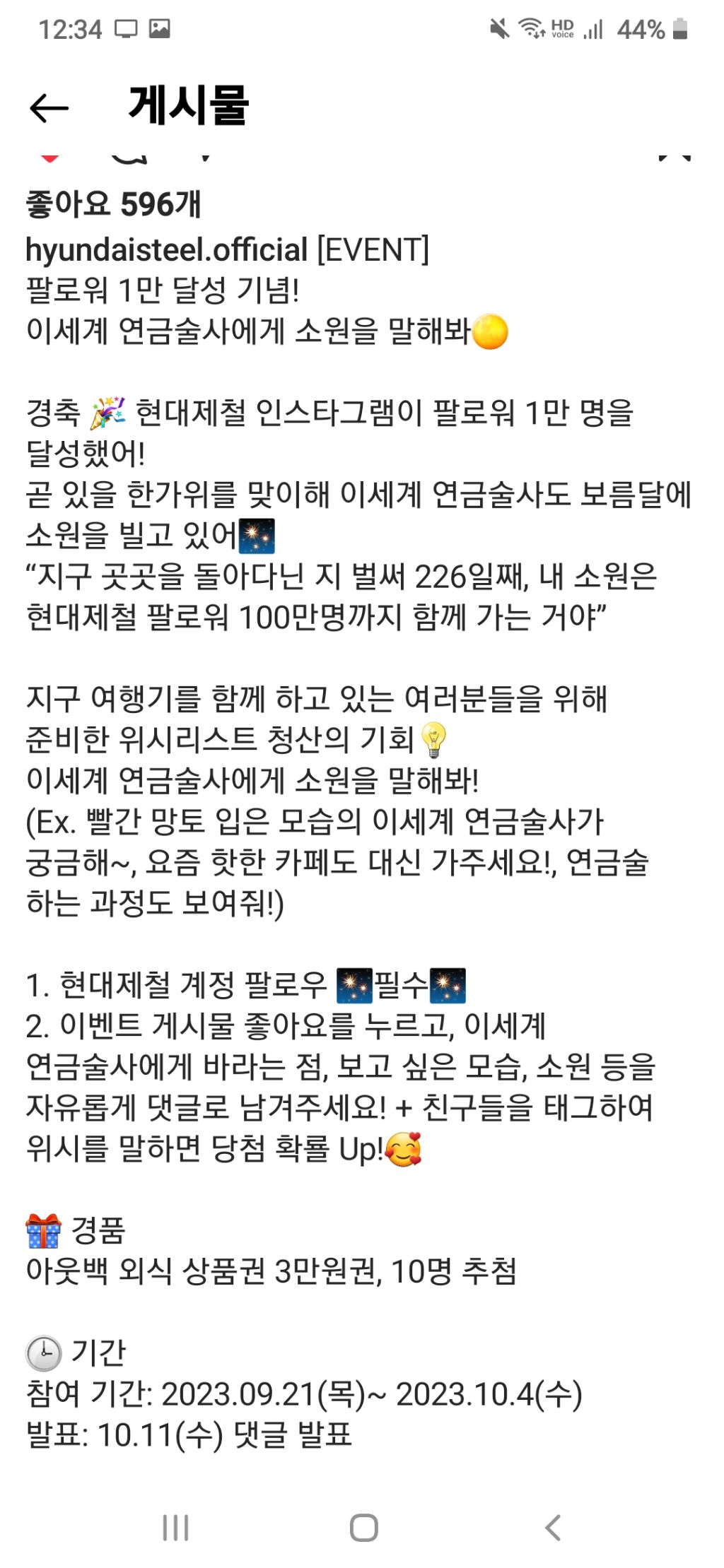 현대제철 팔로워 1만 달성 기념 소원을 말해봐(~10.4) 작성자나도쫌|작성시간23.10.02|조회수156 목록 댓글 1 글자크기 작게가 글자크기 크게가 https://www.instagram.com/p/Cxb7JlhPo46/?igshid=MzRlODBiNWFlZA== 다음검색 현재 게시글 추가 기능 열기 북마크 공유하기 신고 센터로 신고 댓글 댓글 1 댓글쓰기 답글쓰기 댓글 리스트 작성자네오베르베르 | 작성시간 23.10.03 감사합니다 댓글 전체보기