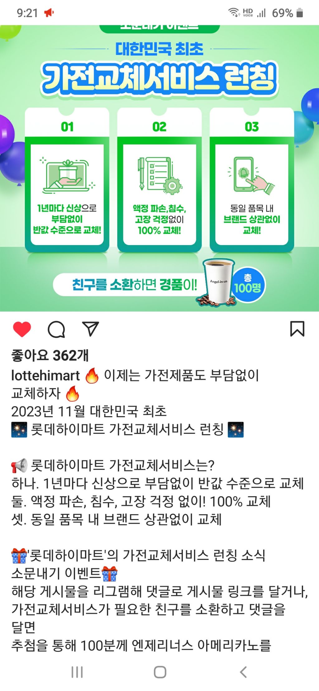 롯데하이마트 가전교체서비스 런칭 소문내기이벤트 (~11.14) 작성자나도쫌|작성시간23.11.05|조회수187 목록 댓글 0 글자크기 작게가 글자크기 크게가 https://www.instagram.com/p/CzFmo-TJFHs/?igshid=MWN5d2VwbGxxcjVxOA== 다음검색 현재 게시글 추가 기능 열기 북마크 공유하기 신고 센터로 신고 댓글 댓글 0 댓글쓰기 답글쓰기 댓글 리스트