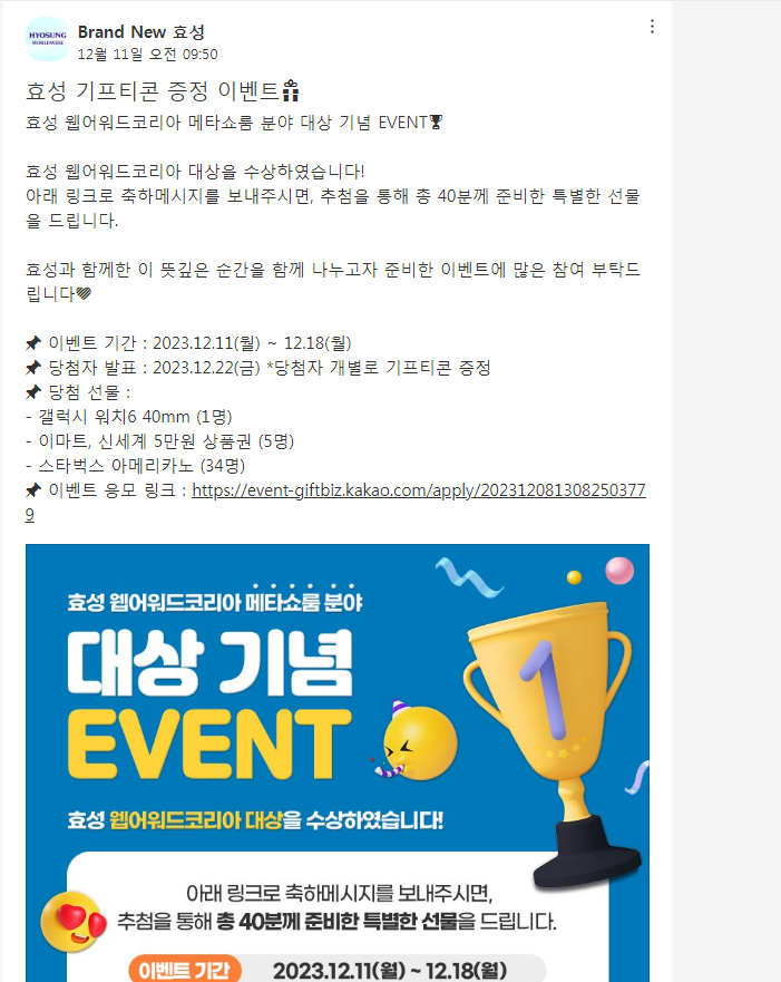 Brand New 효성, 웹어워드코리아 메타쇼룸 분야 대상 기념 이벤트 (~12.18) 작성자유운이|작성시간23.12.14|조회수245 목록 댓글 2 글자크기 작게가 글자크기 크게가 https://pf.kakao.com/_XFZvb/103217092효성 기프티콘 증정 이벤트🎁효성 웹어워드코리아 메타쇼룸 분야 대상 기념 EVENT🏆 효성 웹어워드코리아 대상을 수상하였습니다! 아래 링크로 축하메시지를 보내주시면, 추첨을 통해 총 40분께 준비한 특별한 선물을 드립pf.kakao.com 다음검색 현재 게시글 추가 기능 열기 북마크 공유하기 신고 센터로 신고 댓글 댓글 2 댓글쓰기 답글쓰기 댓글 리스트 작성자네오베르베르 | 작성시간 23.12.14 감사합니다 작성자스무디퀸 | 작성시간 23.12.18 ㅇㅁ ㄳ 댓글 전체보기
