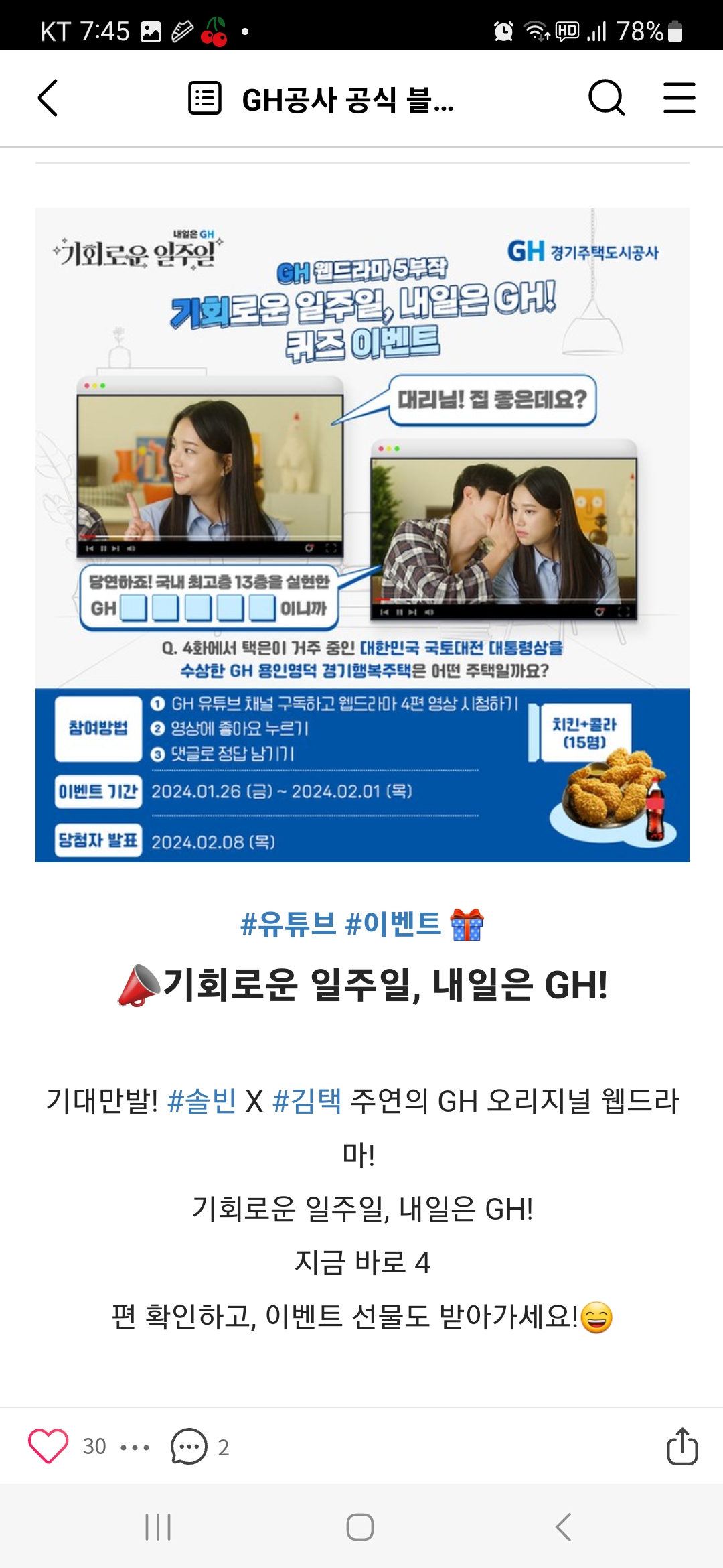 GH경기주택도시공사 퀴즈이벤트 (~2.1) 작성자난이언니|작성시간24.01.27|조회수248 목록 댓글 1 글자크기 작게가 글자크기 크게가 https://m.blog.naver.com/gico12/223334454628 다음검색 현재 게시글 추가 기능 열기 북마크 공유하기 신고 센터로 신고 댓글 댓글 1 댓글쓰기 답글쓰기 댓글 리스트 작성자네오베르베르 | 작성시간 24.01.27 감사합니다 댓글 전체보기