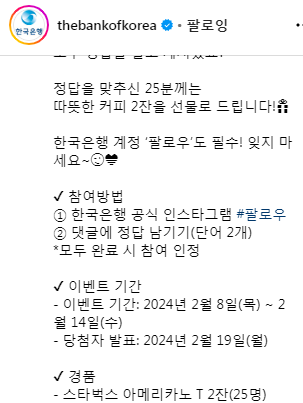 한국은행 초성 퀴즈 이벤트 ~2.14 작성자야콩|작성시간24.02.08|조회수176 목록 댓글 3 글자크기 작게가 글자크기 크게가 https://www.instagram.com/p/C3EvDNKtBPE/ 다음검색 현재 게시글 추가 기능 열기 북마크 공유하기 신고 센터로 신고 댓글 댓글 3 댓글쓰기 답글쓰기 댓글 리스트 작성자벼락부자되기 | 작성시간 24.02.08 🩷 작성자Garlic05 | 작성시간 24.02.08 감사합니다. 작성자네오베르베르 | 작성시간 24.02.09 감사합니다 댓글 전체보기