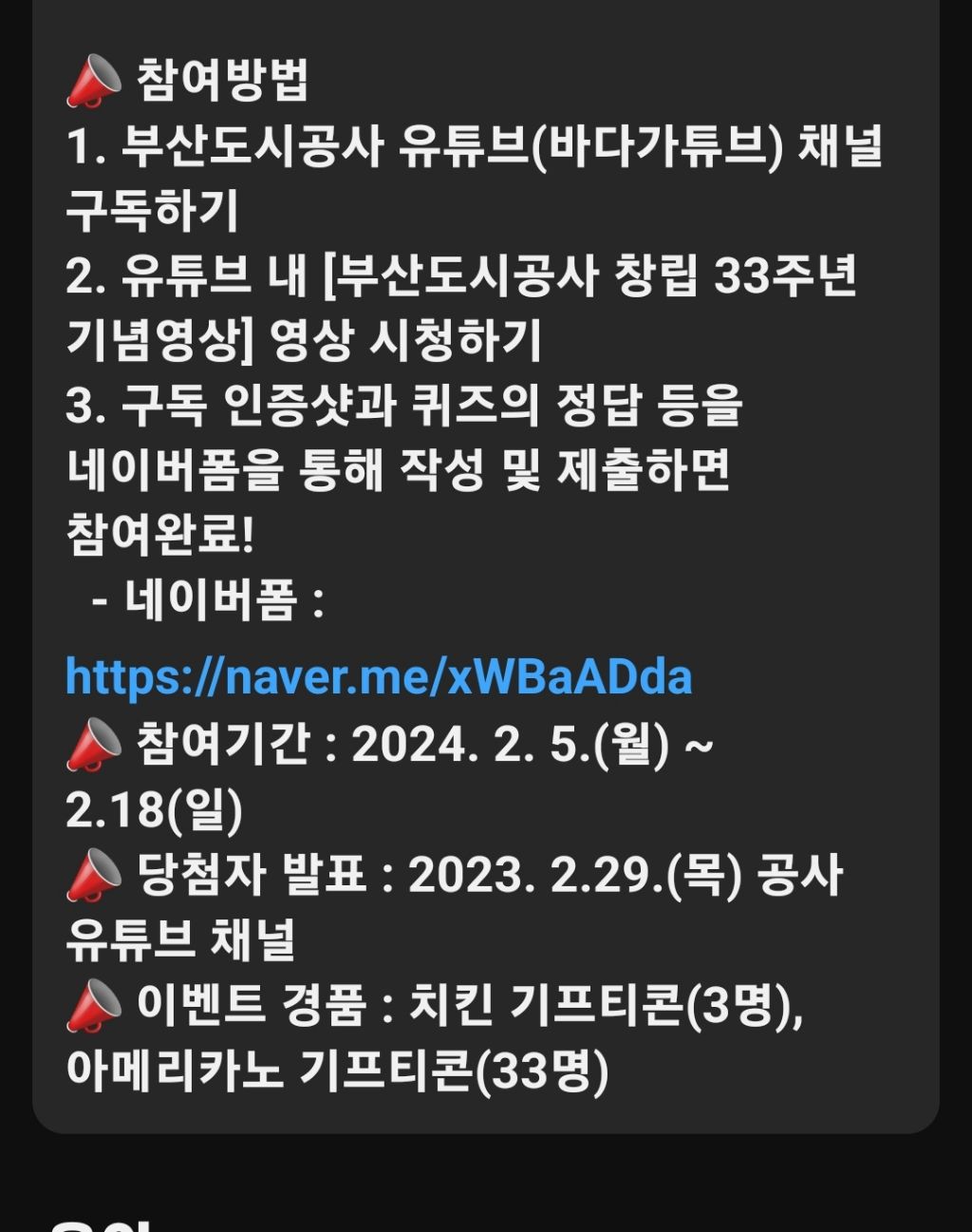 부산도시공사유튜브 바다가튜브 창립33주년 기념 영상 퀴즈이벤트 (~2.18) 작성자나도쫌|작성시간24.02.12|조회수226 목록 댓글 3 글자크기 작게가 글자크기 크게가 https://www.youtube.com/watch?v=AWKUDfoLBHw 다음검색 현재 게시글 추가 기능 열기 북마크 공유하기 신고 센터로 신고 댓글 댓글 3 댓글쓰기 답글쓰기 댓글 리스트 작성자네오베르베르 | 작성시간 24.02.12 감사합니다 작성자Garlic05 | 작성시간 24.02.13 감사합니다 작성자스무디퀸 | 작성시간 24.02.16 ㅇㅁ ㄳ 댓글 전체보기