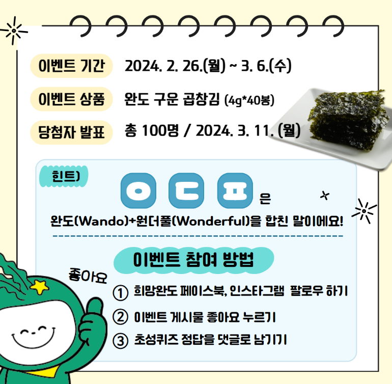 희망완도 SNS 초성 퀴즈 이벤트 ~3.6 작성자야콩|작성시간24.02.26|조회수232 목록 댓글 1 글자크기 작게가 글자크기 크게가 https://www.facebook.com/wandostory/posts/pfbid02B44HECLDKabJWxgKr97eG1BtgsottMzhGzZcy3jMsAQbXbVYRyQ5xJKai2fmBuYml로그인 또는 가입하여 보기Facebook에서 게시물, 사진 등을 확인하세요.www.facebook.com 다음검색 현재 게시글 추가 기능 열기 북마크 공유하기 신고 센터로 신고 댓글 댓글 1 댓글쓰기 답글쓰기 댓글 리스트 작성자네오베르베르 | 작성시간 24.02.26 감사합니다 댓글 전체보기