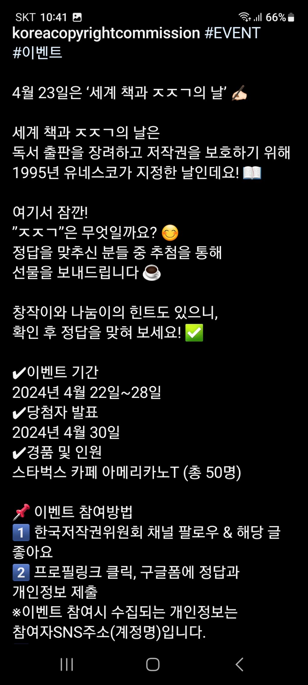 한국저작권위원회 초성퀴즈 이벤트 (~4.28) 작성자나도쫌|작성시간24.04.27|조회수201 목록 댓글 1 글자크기 작게가 글자크기 크게가 https://www.instagram.com/p/C6CvlSnh9PN/?igsh=MW9qYmtiY2JnOWNwcw== 다음검색 현재 게시글 추가 기능 열기 북마크 공유하기 신고 센터로 신고 댓글 댓글 1 댓글쓰기 답글쓰기 댓글 리스트 작성자알뜰아줌 | 작성시간 24.04.28 감사합니다. 댓글 전체보기