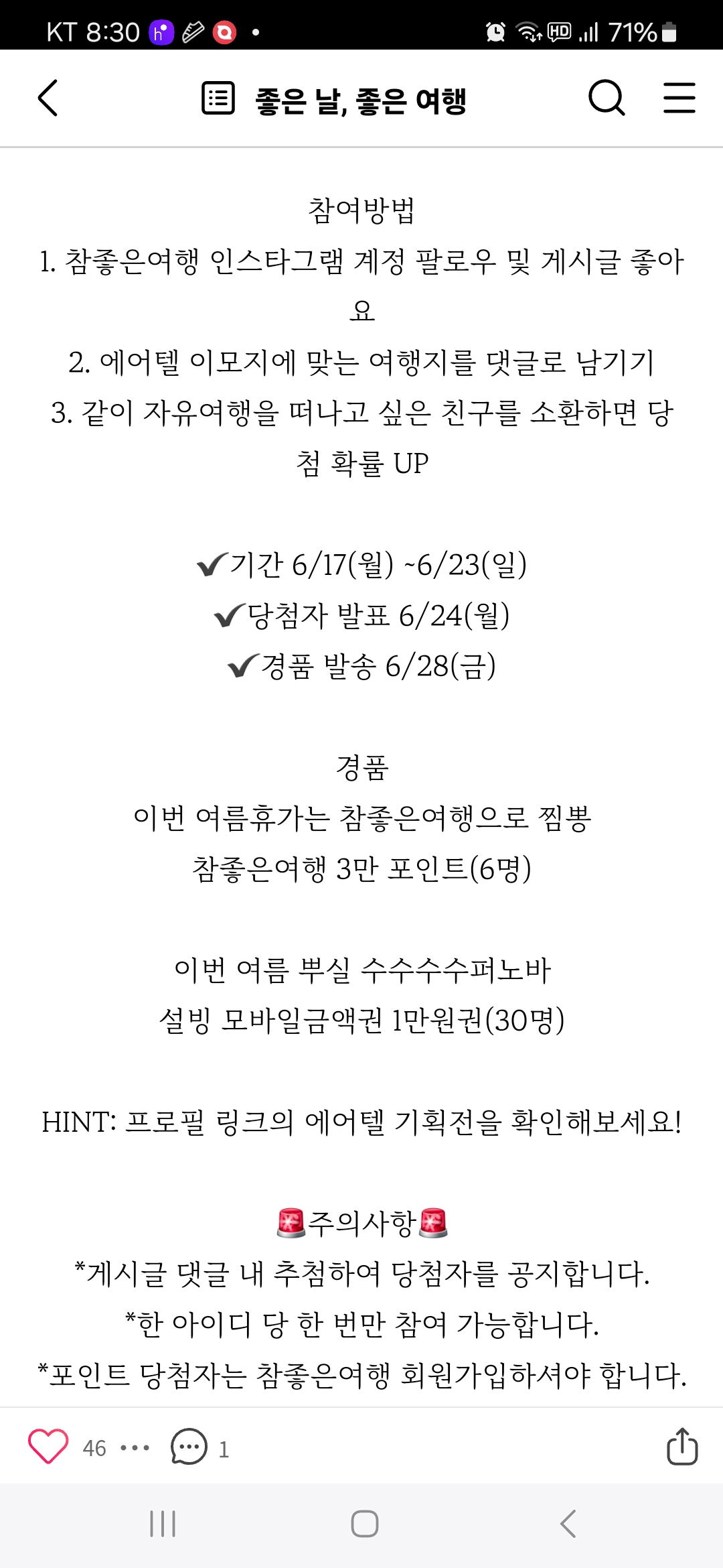 참좋은여행 인스타그램 이모지 퀴즈이벤트(~6.23) 작성자난이언니|작성시간24.06.18|조회수176 목록 댓글 1 글자크기 작게가 글자크기 크게가 https://m.blog.naver.com/vgt0901/223482203085 다음검색 현재 게시글 추가 기능 열기 북마크 공유하기 신고 센터로 신고 댓글 댓글 1 댓글쓰기 답글쓰기 댓글 리스트 작성자네오베르베르 | 작성시간 24.06.18 감사합니다 댓글 전체보기