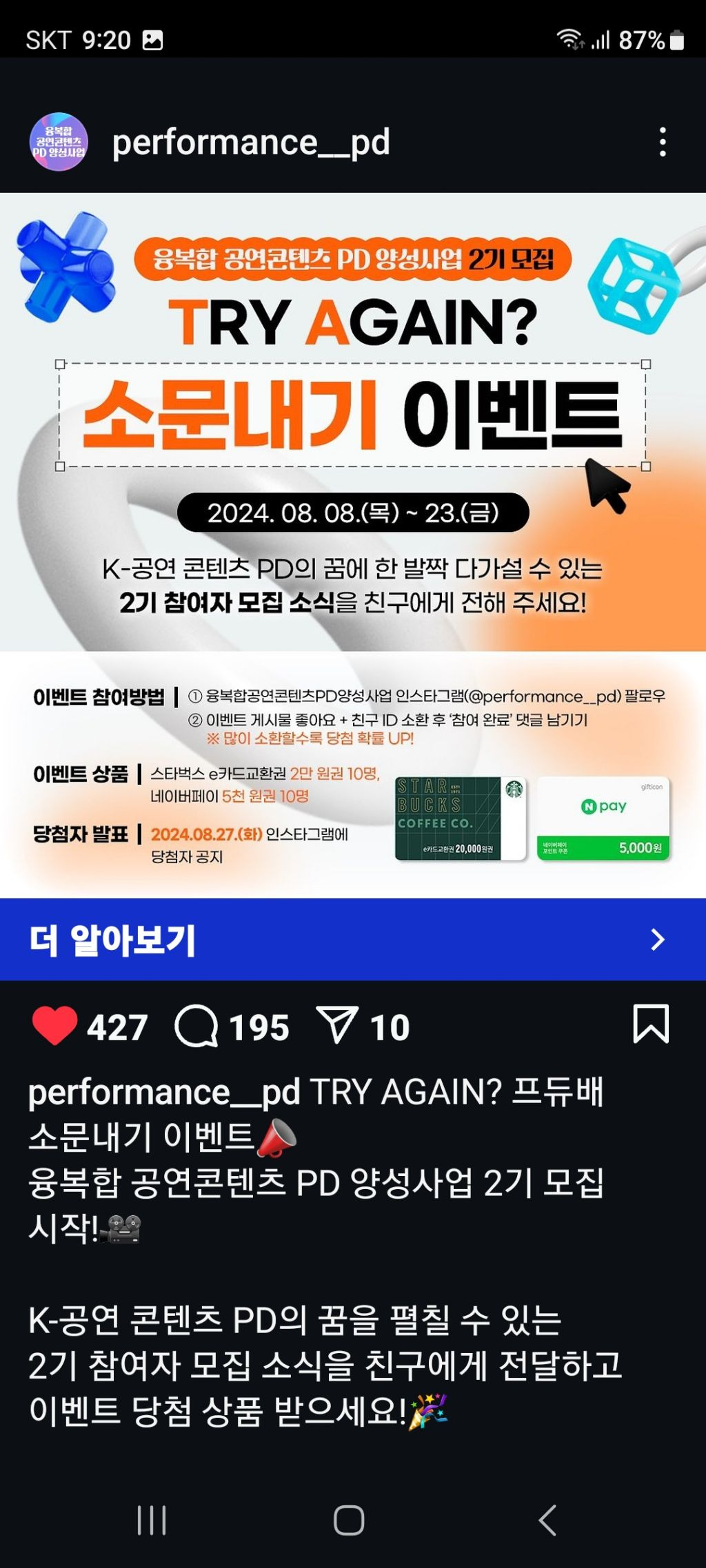융복합공연콘텐츠 PD양성사업 소문내기이벤트 (~8.23) 작성자나도쫌|작성시간24.08.15|조회수134 목록 댓글 2 글자크기 작게가 글자크기 크게가 https://www.instagram.com/p/C-Y57MjybK5/?igsh=MWxnaGZ2eXZwbjZncA== 다음검색 현재 게시글 추가 기능 열기 북마크 공유하기 신고 센터로 신고 댓글 댓글 2 댓글쓰기 답글쓰기 댓글 리스트 작성자네오베르베르 | 작성시간 24.08.15 감사합니다 작성자아오이유우 | 작성시간 24.08.22 감사합니다 댓글 전체보기