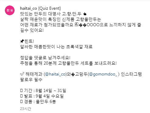 해태제과 퀴즈 이벤트 ~8.31 작성자야콩|작성시간24.08.15|조회수191 목록 댓글 2 글자크기 작게가 글자크기 크게가 https://www.instagram.com/p/C-pNjP5ylqw/?img_index=1 다음검색 현재 게시글 추가 기능 열기 북마크 공유하기 신고 센터로 신고 댓글 댓글 2 댓글쓰기 답글쓰기 댓글 리스트 작성자네오베르베르 | 작성시간 24.08.15 감사합니다 작성자아오이유우 | 작성시간 24.08.30 감사합니다 댓글 전체보기