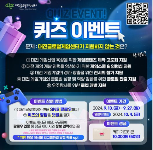 대전글로벌게임센터 퀴즈 이벤트 ~9.27 작성자야콩|작성시간24.09.13|조회수175 목록 댓글 0 글자크기 작게가 글자크기 크게가 https://www.facebook.com/diciagamecenter/posts/pfbid02sNU2TTQtp9uvhb5enoMa7bQGV9yDjbCzyLG3e27qU6yZuGExMnCdcxfkYKKcfQ5fl로그인 또는 가입하여 보기Facebook에서 게시물, 사진 등을 확인하세요.www.facebook.com 다음검색 현재 게시글 추가 기능 열기 북마크 공유하기 신고 센터로 신고 댓글 댓글 0 댓글쓰기 답글쓰기 댓글 리스트