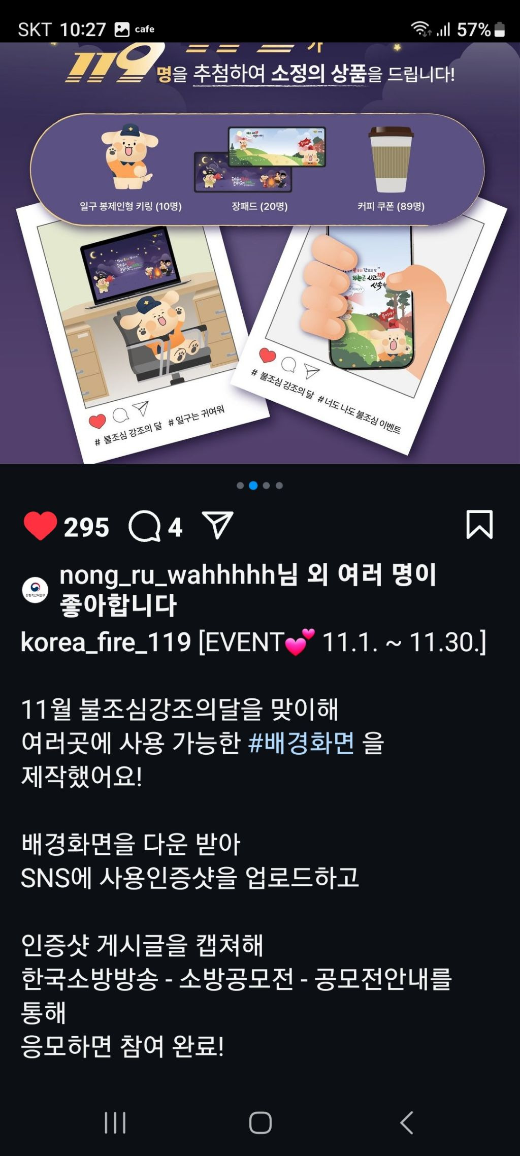 소방청 . 너도 나도 불조심 이벤트 (~11.30) 작성자나도쫌|작성시간24.10.31|조회수165 목록 댓글 0 글자크기 작게가 글자크기 크게가 https://www.instagram.com/p/DBx77y3TymV/?igsh=djk5Mnk2MnVyOHkz 다음검색 현재 게시글 추가 기능 열기 북마크 공유하기 신고 센터로 신고 댓글 댓글 0 댓글쓰기 답글쓰기 댓글 리스트