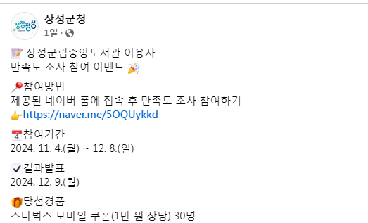 장성군청 만족도 조사 참여 이벤트 ~12.8 작성자야콩|작성시간24.11.07|조회수172 목록 댓글 3 글자크기 작게가 글자크기 크게가 https://www.facebook.com/yellowcityjs/posts/pfbid0VzXZmKF9s7N8x9CZvudQWpmyokmiXTepKxm15fGxPTv6WLMak64vqYVwCQaWFnNwl로그인 또는 가입하여 보기Facebook에서 게시물, 사진 등을 확인하세요.www.facebook.com 다음검색 현재 게시글 추가 기능 열기 북마크 공유하기 신고 센터로 신고 댓글 댓글 3 댓글쓰기 답글쓰기 댓글 리스트 작성자네오베르베르 | 작성시간 24.11.08 감사합니다 작성자팥빙수좋아라 | 작성시간 24.11.10 감사합니다 작성자응찡이 | 작성시간 24.12.11 감사합니당 ㅎㅎ 댓글 전체보기