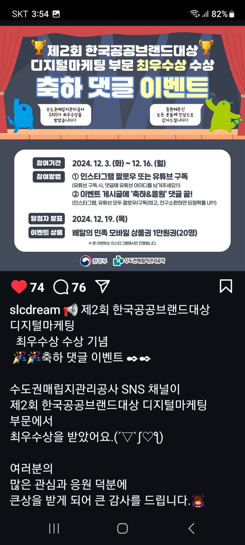 수도권매립지 관리공사 축하댓글 이벤트 (~12.16) 작성자나도쫌|작성시간24.12.03|조회수139 목록 댓글 2 글자크기 작게가 글자크기 크게가 https://www.instagram.com/p/DDGvTQ1TxHZ/?igsh=MWw1MjFieHVubW54aA== 다음검색 현재 게시글 추가 기능 열기 북마크 공유하기 신고 센터로 신고 댓글 댓글 2 댓글쓰기 답글쓰기 댓글 리스트 작성자Garlic05 | 작성시간 24.12.03 감사합니다. 작성자네오베르베르 | 작성시간 24.12.04 감사합니다 댓글 전체보기